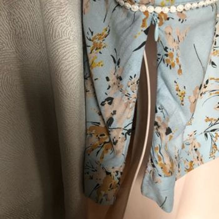 Trop joli crop top bleu ciel fleuri moutarde grège Biais dentelle pris dans les coutures devant Fermeture latérale invisible Taille 36 Plus d’étiquette de composition, je dirais de la viscose Marque Atmosphere Largeur à plat en bas 37 cm Aisselle à aisselle 41,8 cm Hauteur côté 24,5 cm