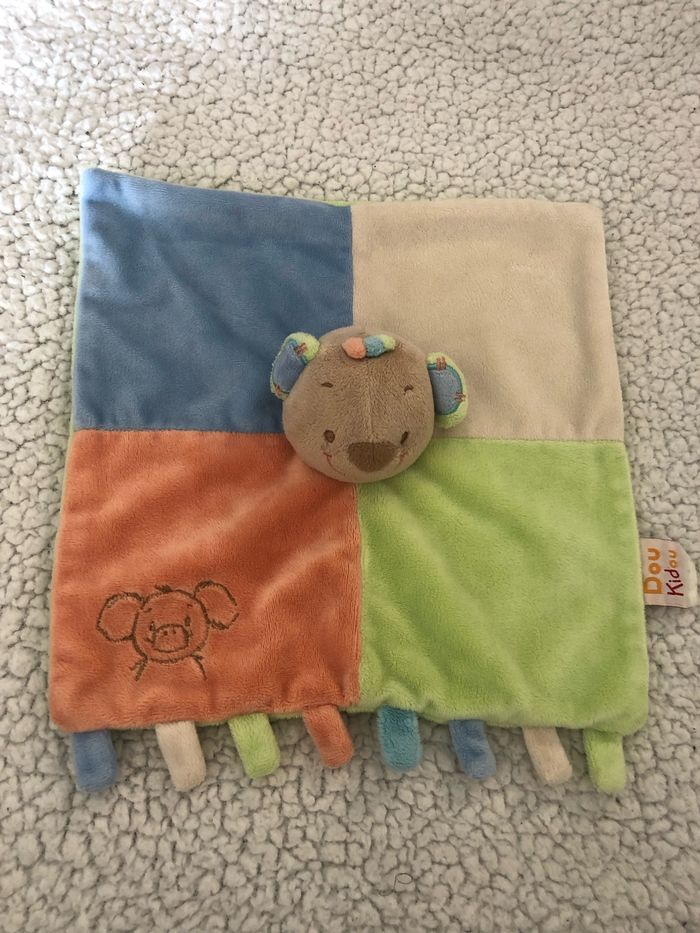 Doudou plat carré Koala bleu orange vert beige Au dos uni vert En broderie: un cochon +/- 25cm Doukidou Occasion en très bon état Vous achetez le doudou que vous voyez sur la photo