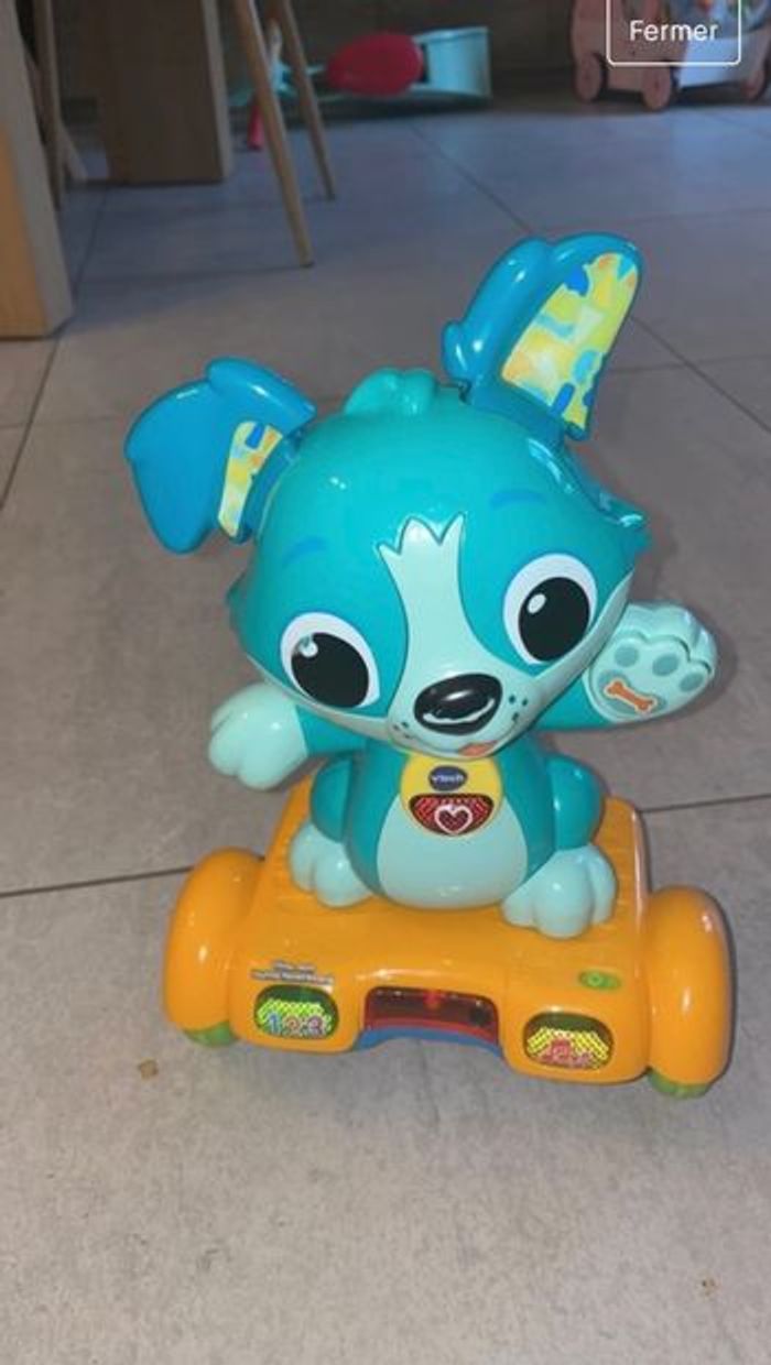 Titou mon toutou hoverboard marque vtech Robot interactif qui a des capteur afin que l’enfant lui court après plusieurs fonction Tourne joue chante compte …. A très peu servis fonctionne très bien Traces d’usure sur le nez Valeur neuve 40€