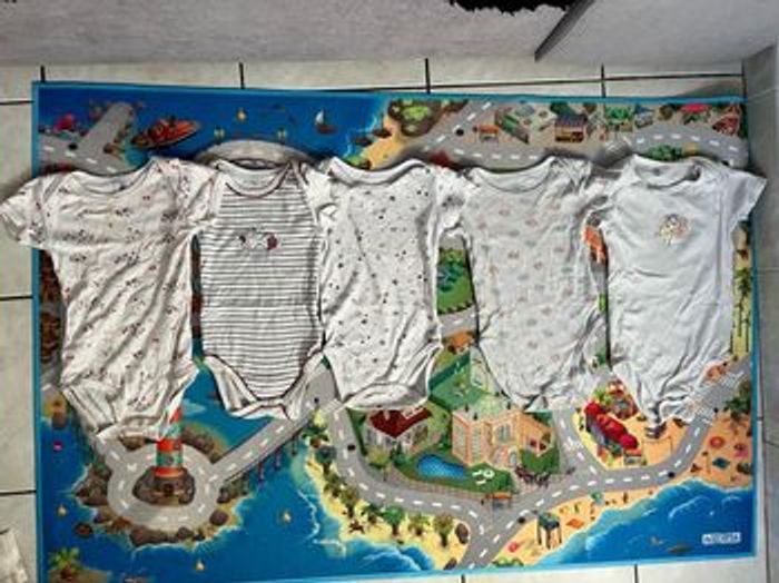 Lot de 5 body à manches courtes de taille 24 mois. Ils sont de plusieurs marques différentes de petit bateau, tex baby, Disney et terre de marine . Il y en a 2 en bon état et les 3 autres sont dans un état satisfaisant ( 1 à un trou , un autre des peluches et le dernier à l’autocollant marie qui se décolle ) mais peuvent être portés . Photos pour les bodys abîmés