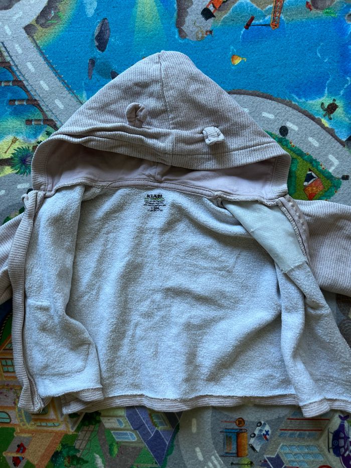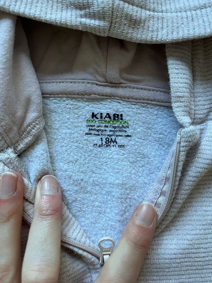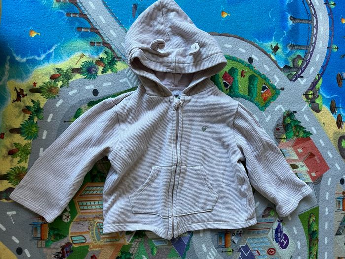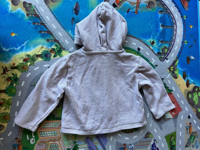 Gilet à capuche avec petites oreilles de couleur rose à rayures argentée et pailletée. Taille 18 mois en très bon état. Vient de chez Kiabi