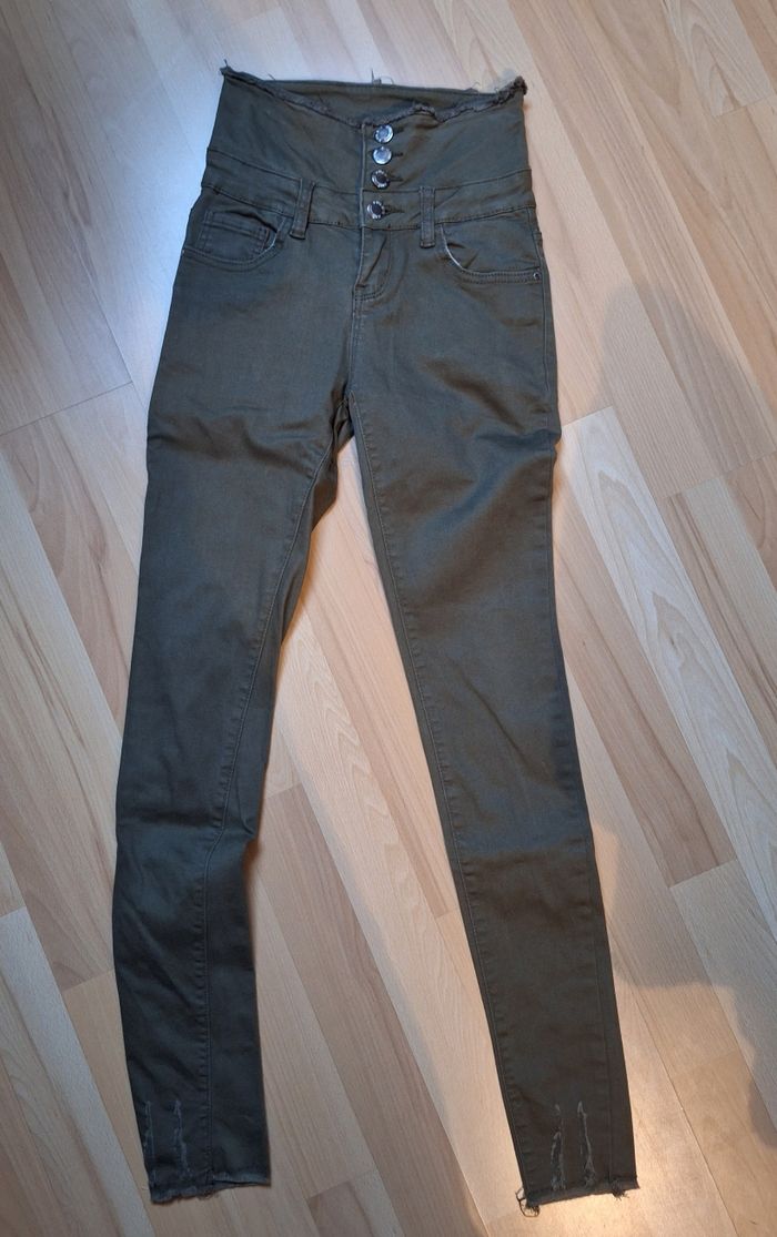 FEMME 34 / XS N°1273 jeans kaki Taille haute , au dos 32 cm Bouton , fermeture eclair Longueur 100 cm 78% coton 20% polyester 2% spandex Taille 34 / xs New collection 6€ #kelly_femmeT34