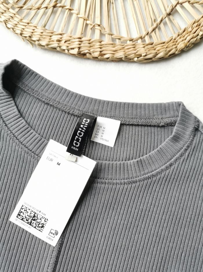 👩 Top côtelé 👩 H&M 🖊️ ÉTAT ✅️: Parfait👌- Avec étiquette🏷️- Jamais porté 🆕 🖊️ DESCRIPTION 👕: ▪️Taille M ▪️Matière: 95% coton - 5% elasthanne ▪️Tissu en jersey côtelé ▪️Coupe droite ajustée ▪️Col rond ▪️Manches très longues ▪️Couleur: Gris foncé 💰Prix boutique: 25.99€ 🖊️ MESURES 📐: • 📏 Mesure épaules: 38 cm • 📏 Mesure sous aisselles: 38 cm • 📏 Longueur: 48 cm 📷 Photos du site avec l'article porté disponibles sur demandes 📷 🌹
