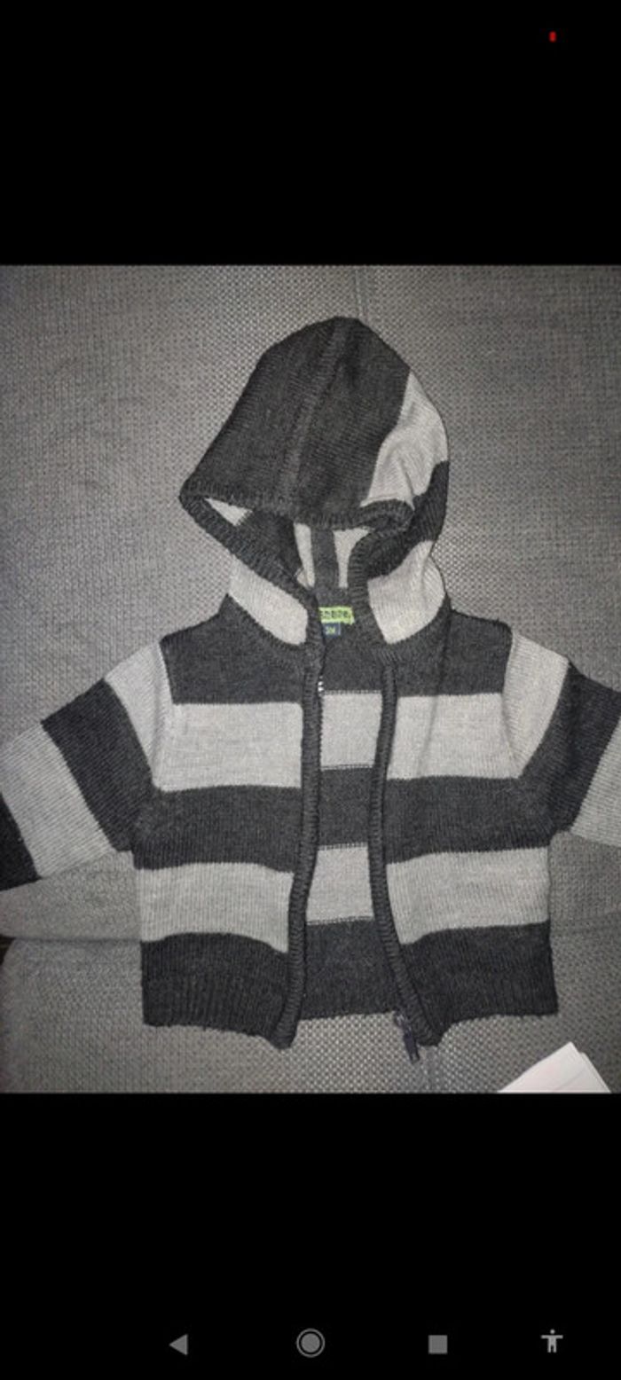 Gilet rayé gris à capuche, avec fermeture éclair 100 % acrylique Taille 3 mois #lydie59192nvetementsbébé