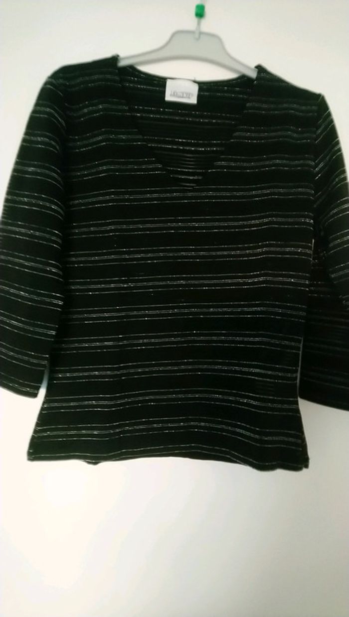 Manches 3/4 Noir rayé argent Légèrement transparent derrière mais il est doublé devant 90%polyamide 6%élastane 4%métal Très peu porté Taille 2 mais taille un peu petit, correspond à un taille 1 (36) #lydie59192nvetementsfemmes36