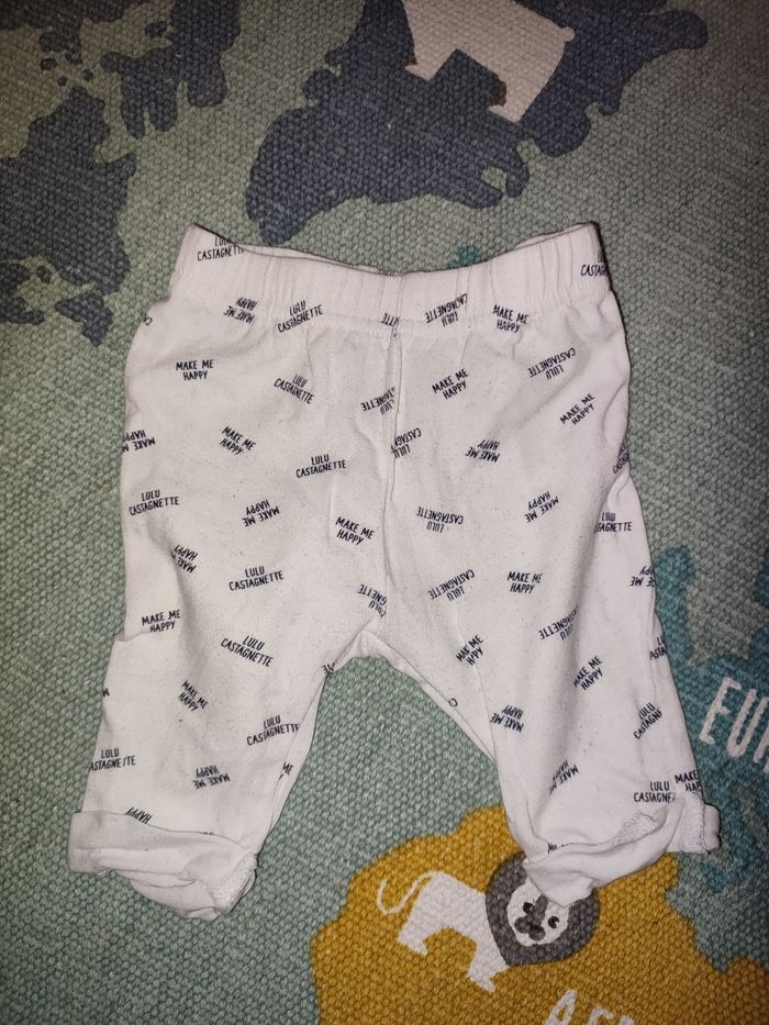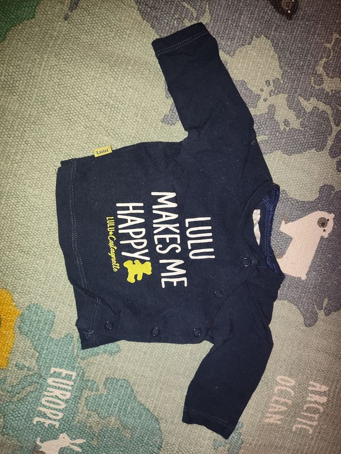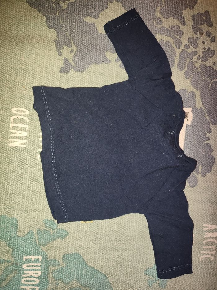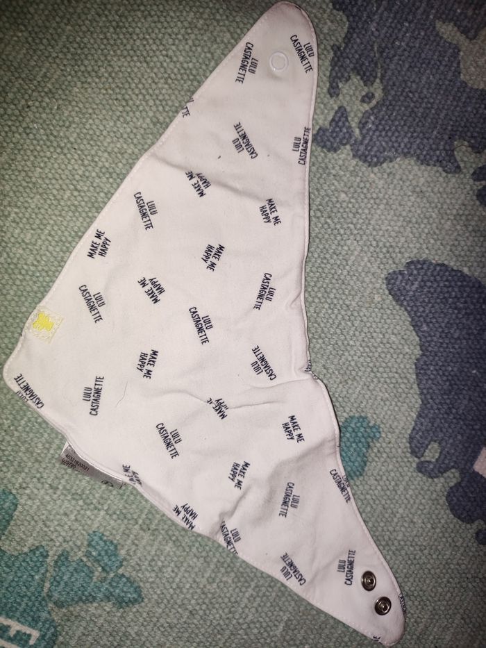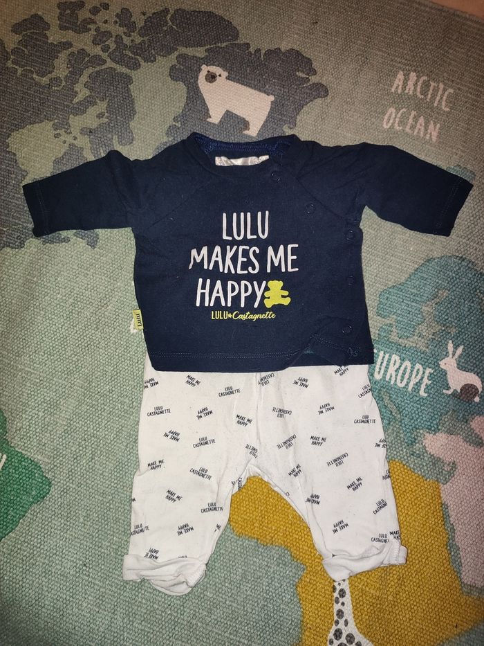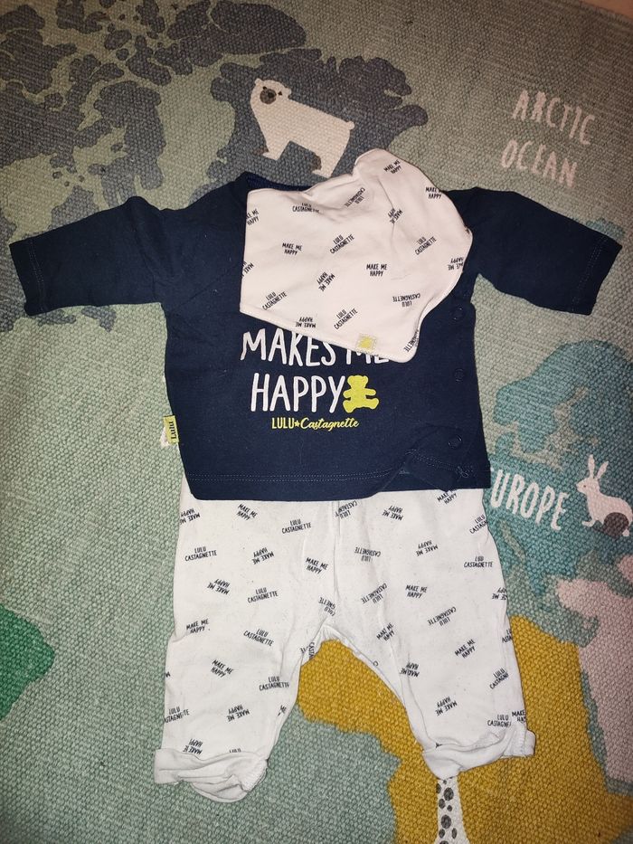 Ensemble legging et T-shirt manches longues avec bavoir bandana. T-shirt bleu marine avec fermeture pression sur l avant Legging blanc, écriture bleue Et bavoir forme bandante blanc et écriture bleue.