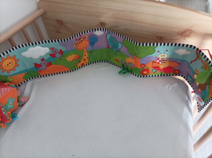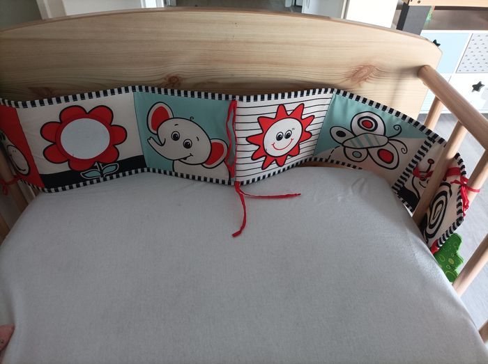 Imagier bébé un côté pour les premiers mois de bébé adapté à sa vue( noir rouge ) avec animaux et miroir et quand bébé grandit un côté pleins de couleur. Sensoriel sur un tapis ou autour d'un lit à adapter suivant vos envies. État impeccable se plie facilement . Envoi rapide