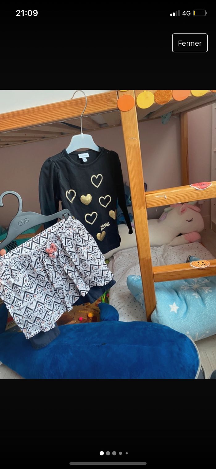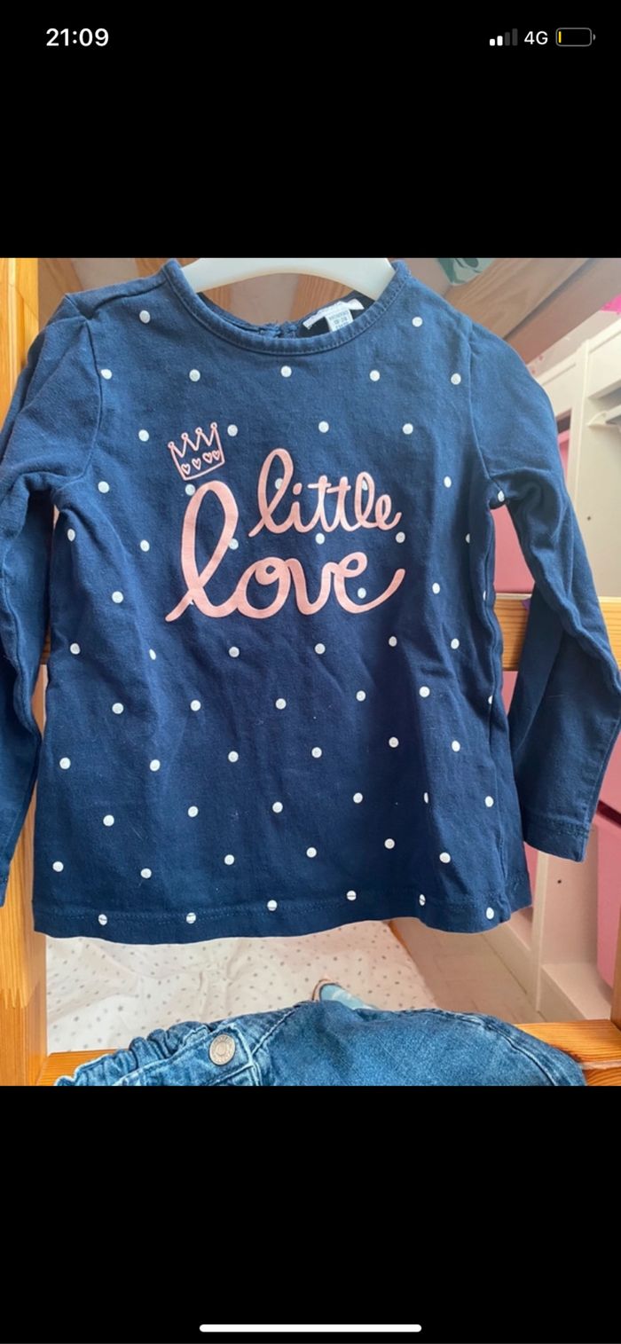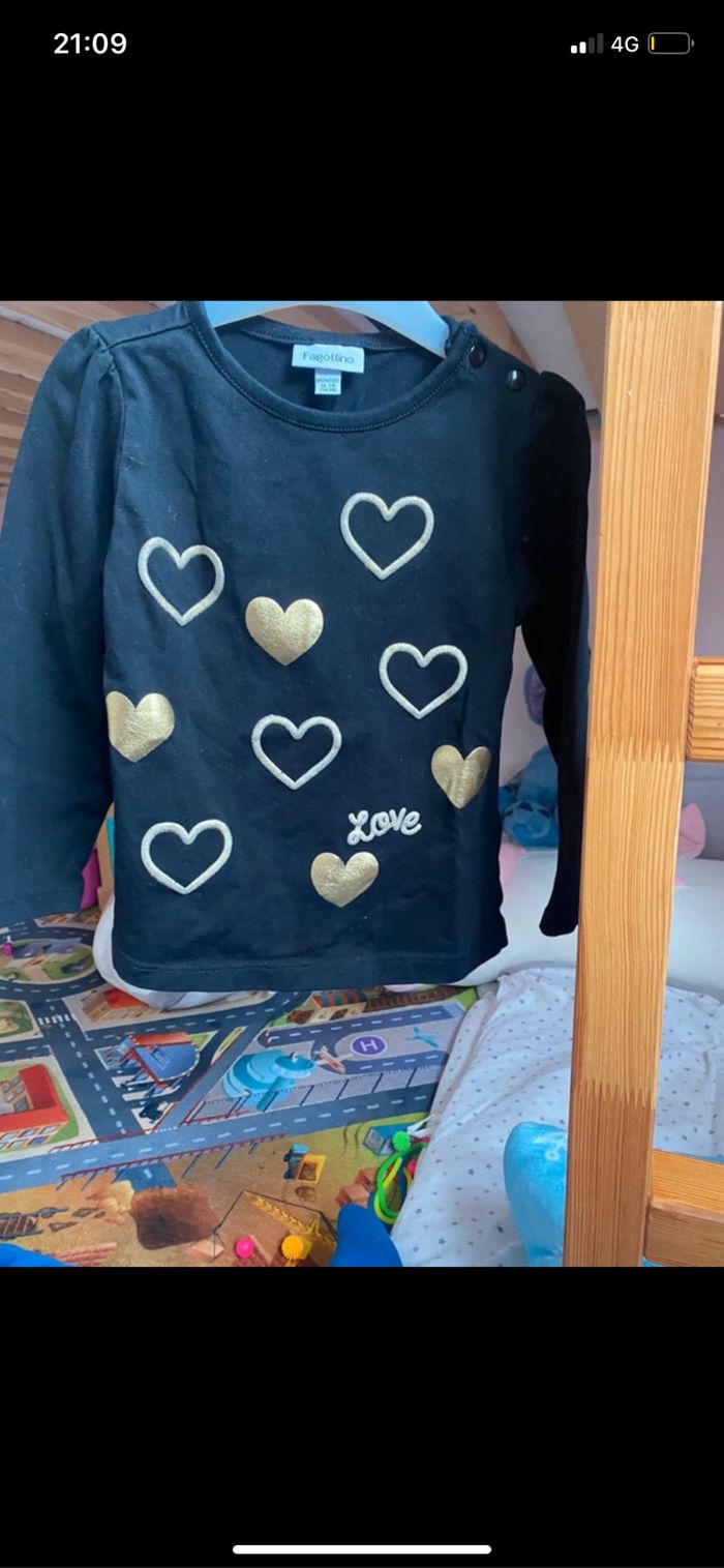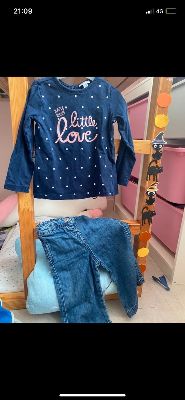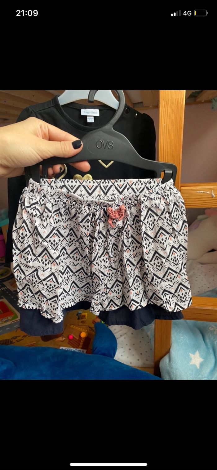 2 ensemble Première enseble : T-shirt noir Fagottino OVS 18-4 mois avec la jupe 18 mois tape à l’œil Deuxième ensemble t-shirt bleu Fagottino 18-24 mois avec jeans large avec poche et élastique à l’intérieur pour régler à la taille 18-24 mois Portée mais en très bonne état