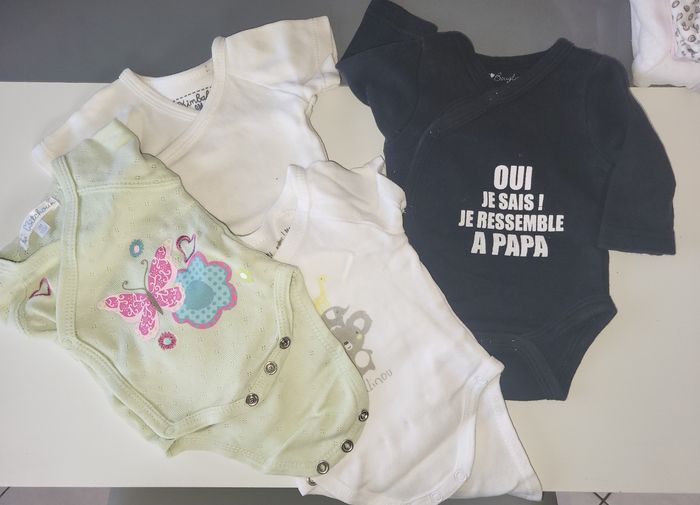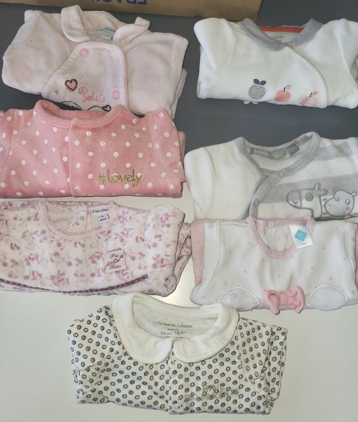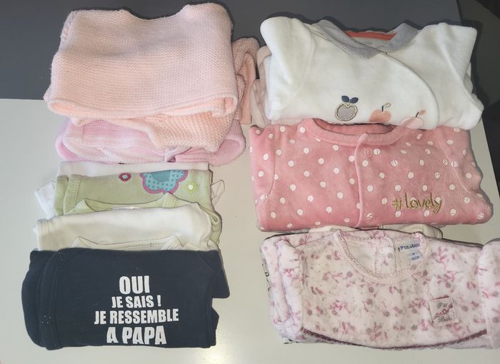 Lots 14 pièces pour petite fille 0 mois comprenant 7 pyjamas 4 bodies et 3 layette en laine idéal pour la maternité . obaibi, petit bisous ect...