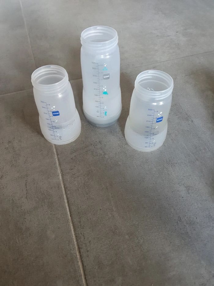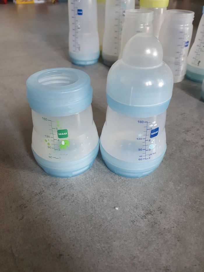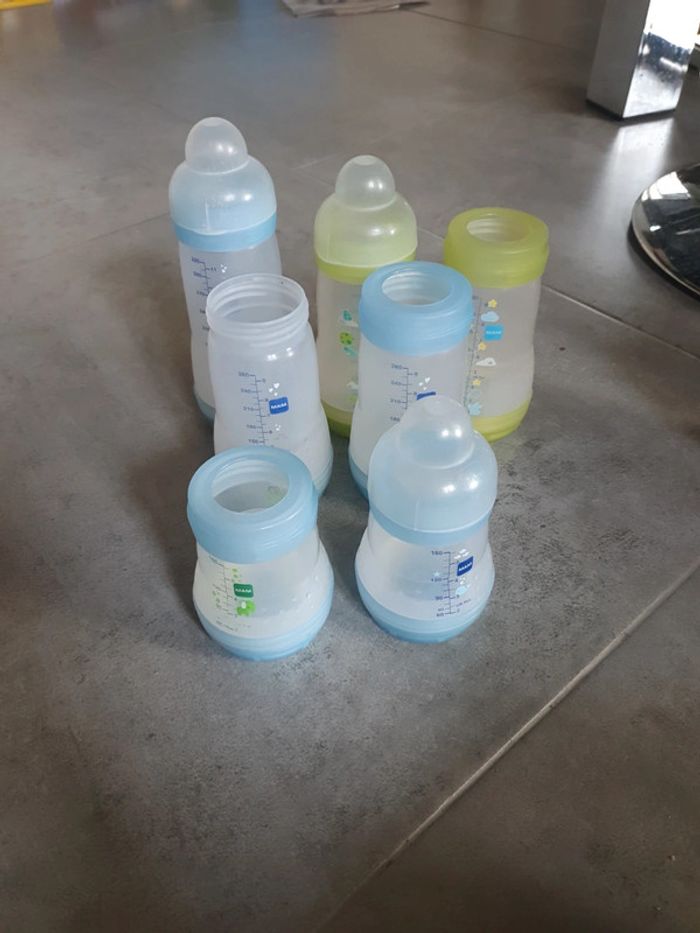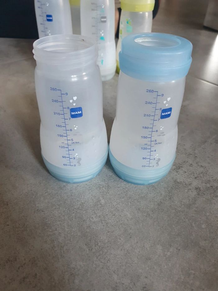 Lot de 10 biberons MAM sans tétine . 2 de 160ml 6 de 260ml 2 de 320 ml Ils sont pas tous complets. Les photos correspondent à ce qu'il y a. N'hésitez pas si vous souhaitez plus d'information