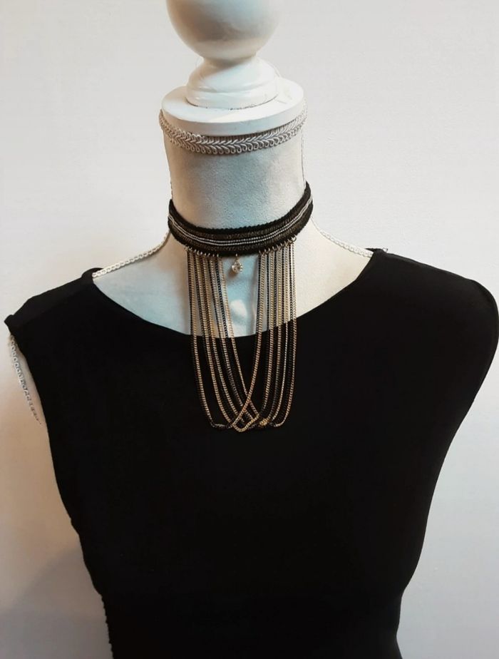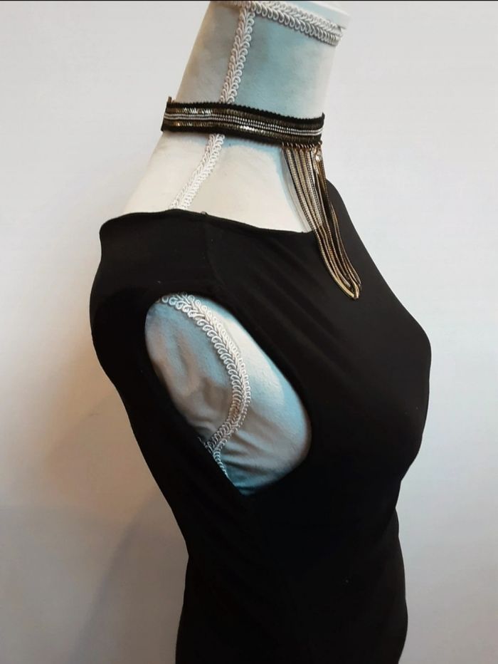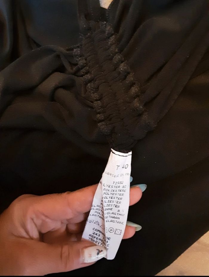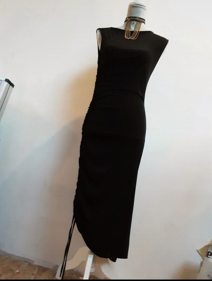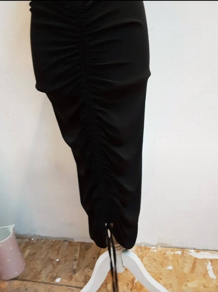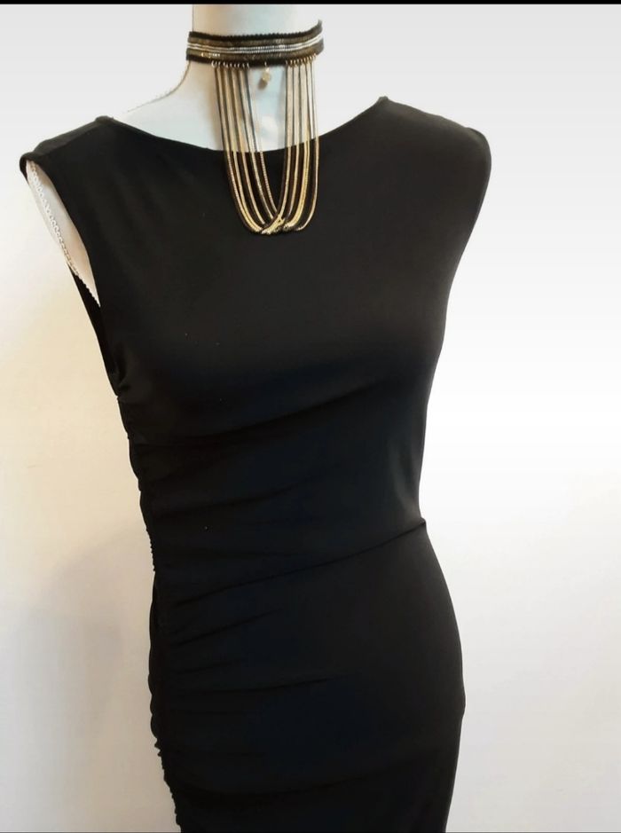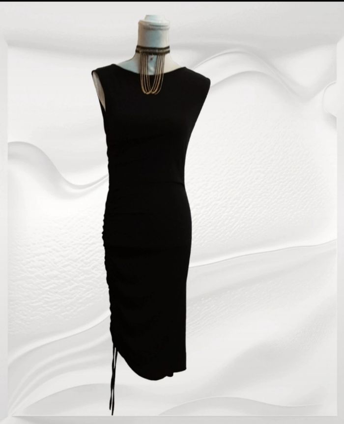 Robe fine noire et légèrement asymetrique. Se fronce par un lacet d un côté. Matière polyester et elastane. Taille 40. Le collier n est pas à vendre