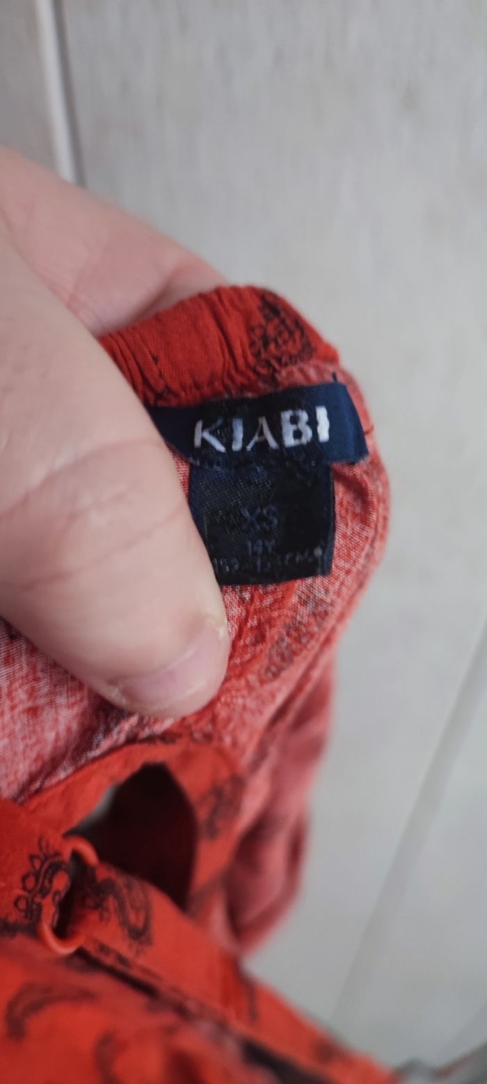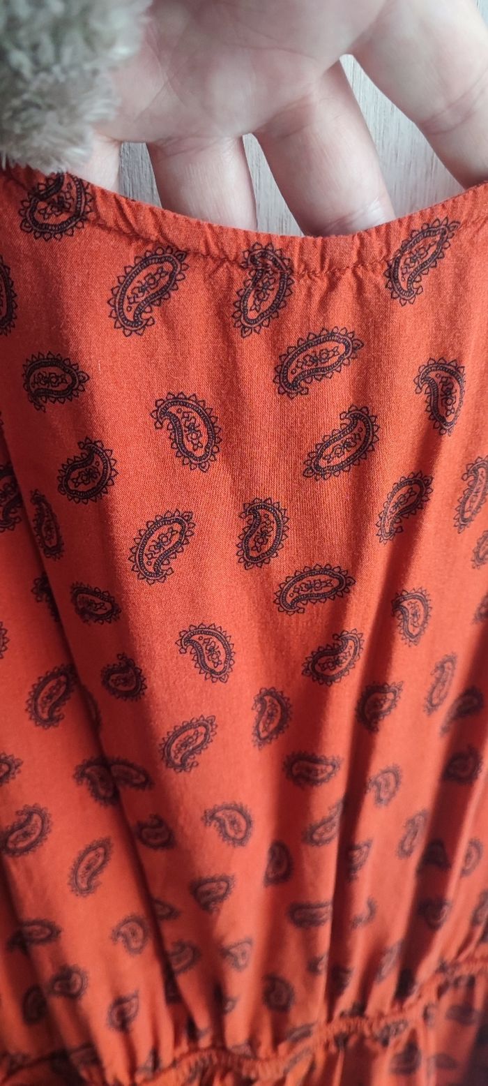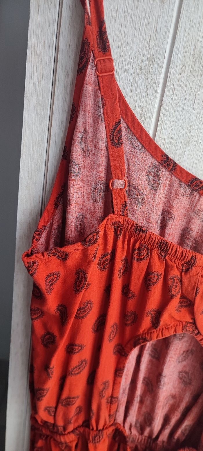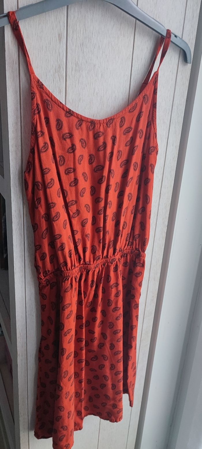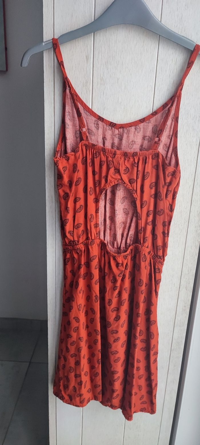 Marque: Kiabi Taille:XS 14ans Couleur: Marron/rouille difficile à dire mais moins vif que sur les photos Matière: Étiquette coupée mais matière fluide et légere État:En parfait état Non doublée avec bretelles réglables et taille élastique