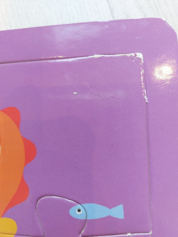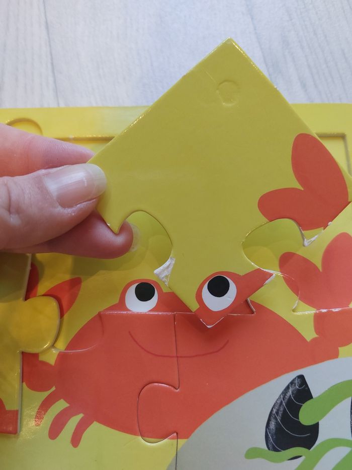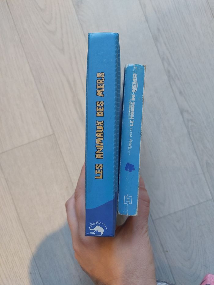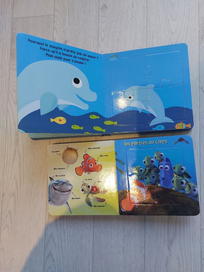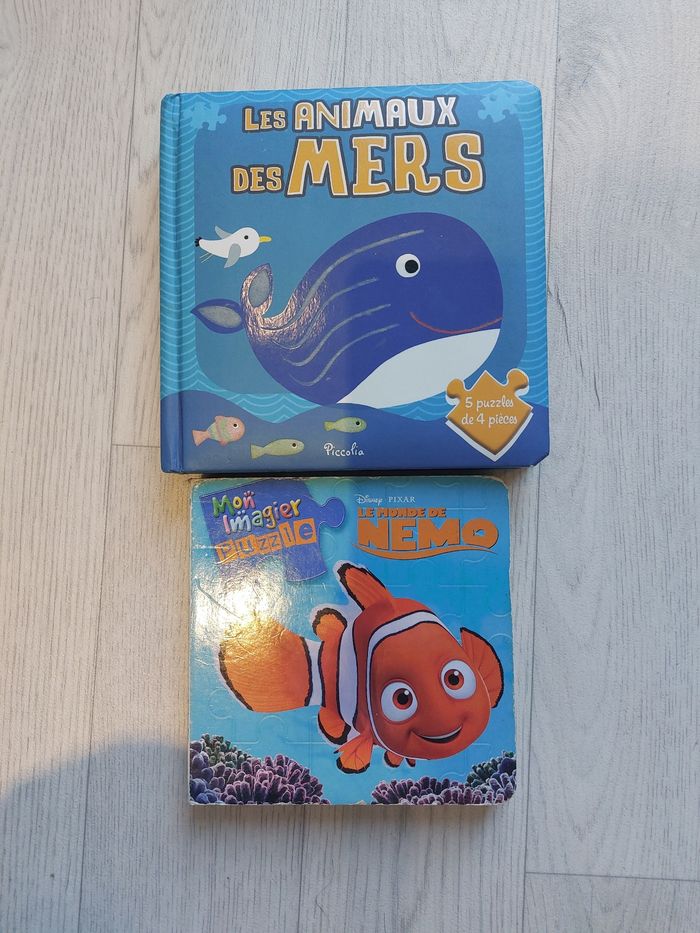 2 livres pages cartonnées de puzzles 4 pièces sur le thème de la mer, 1 imagier puzzle le monde de Nemo edition hachette et les animaux de la mer edition piccolia. Toutes les pages sont en photo le disney à l'extérieur un peu usé au niveau de la tranche couverture voir photo et 1 des puzzle du 2eme à un défaut mais est entier (voir photo crabe)