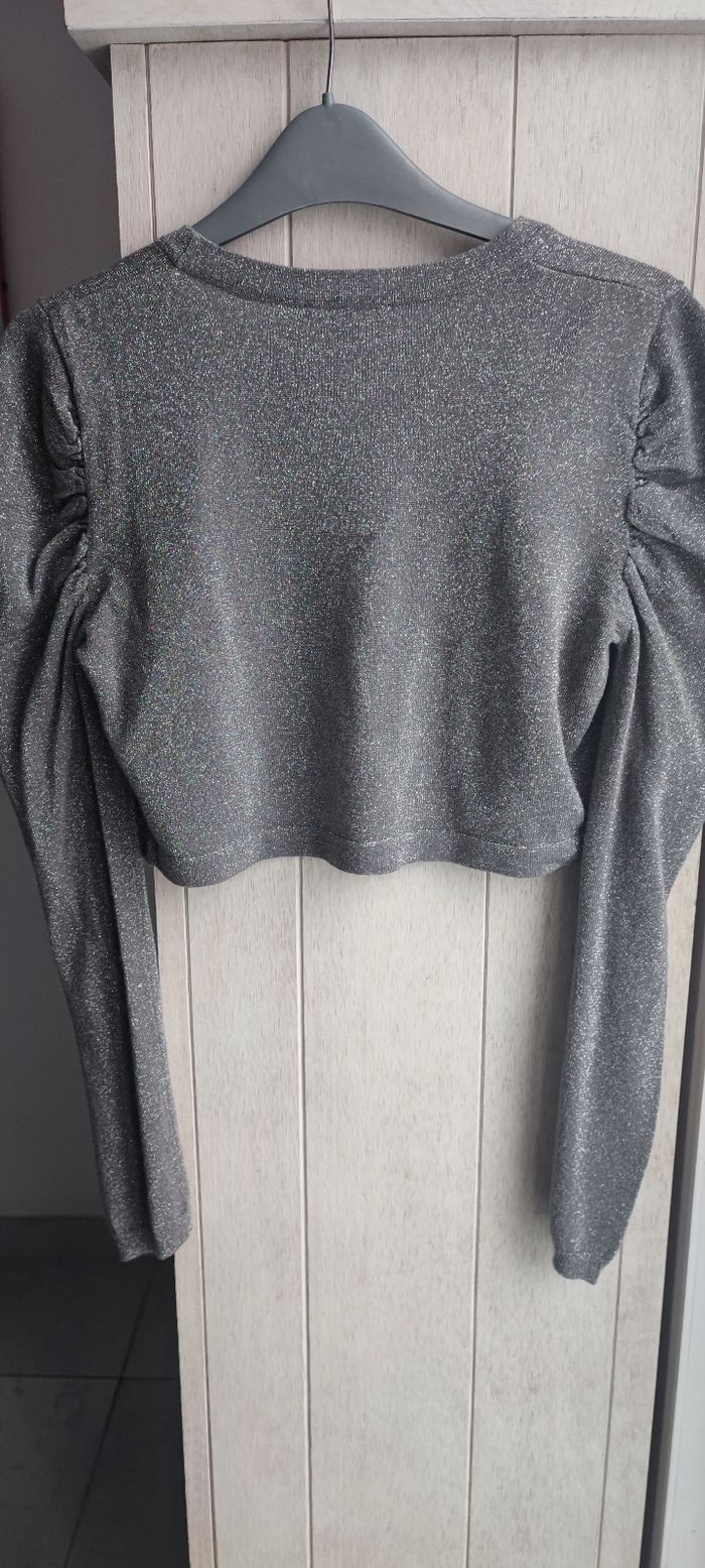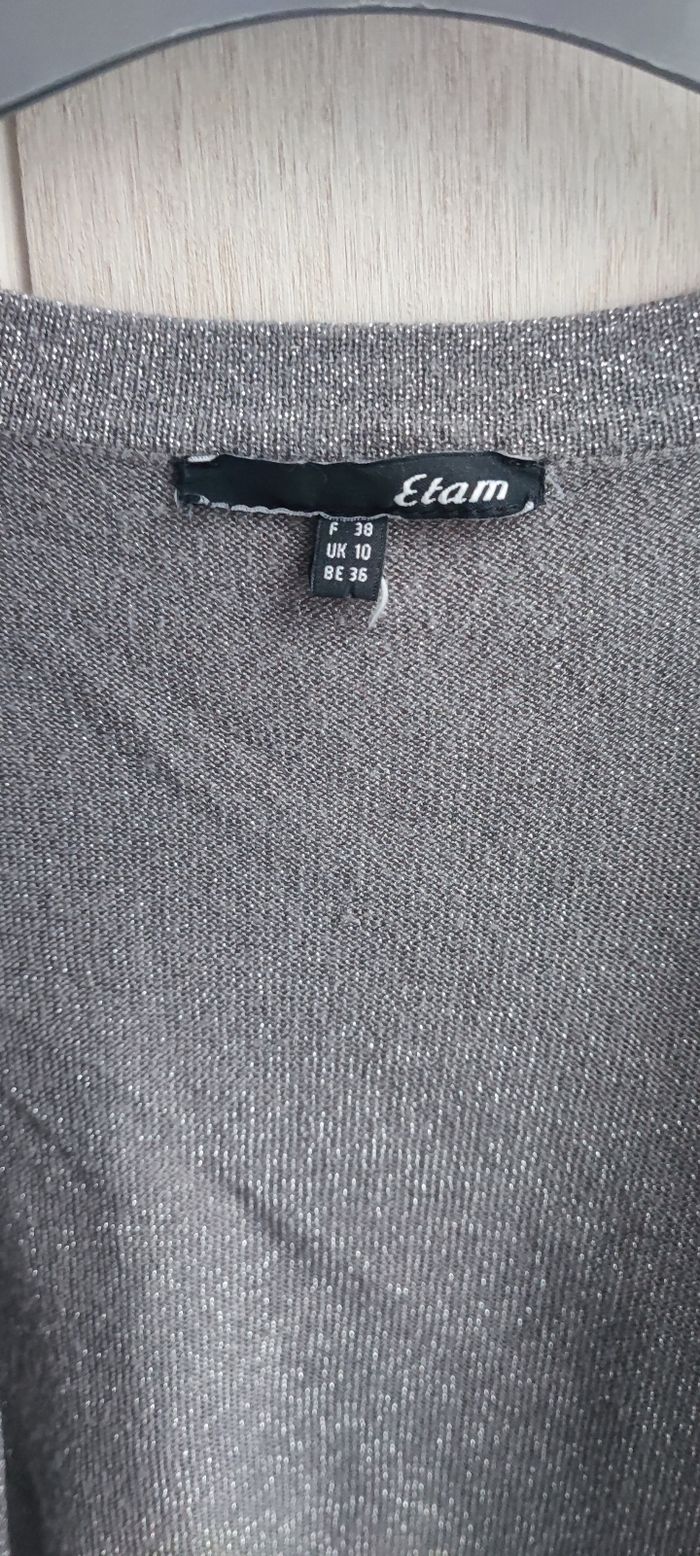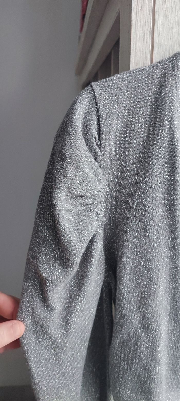 Marque:Etam Taille:38 mensurations en photo Couleur:Gris à paillettes argentées Matière: Étiquette coupée État:En parfait état peu porté Pas de photos portées je ne rentre pas dedans, matière fine et légère,ne se ferme pas Manches longues, bouffantes aux épaules