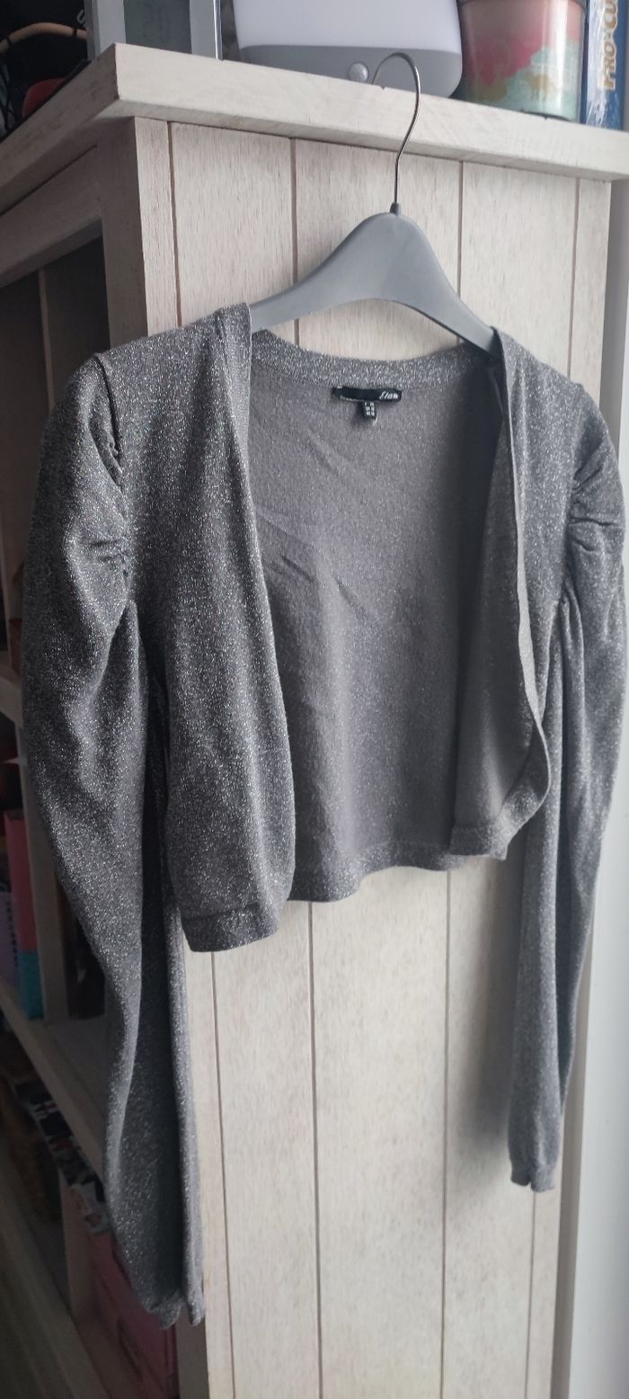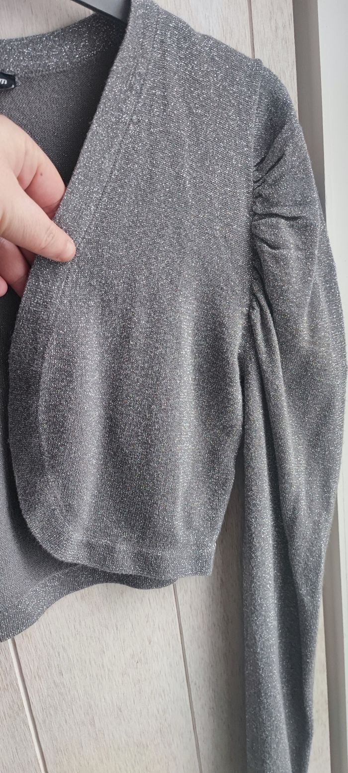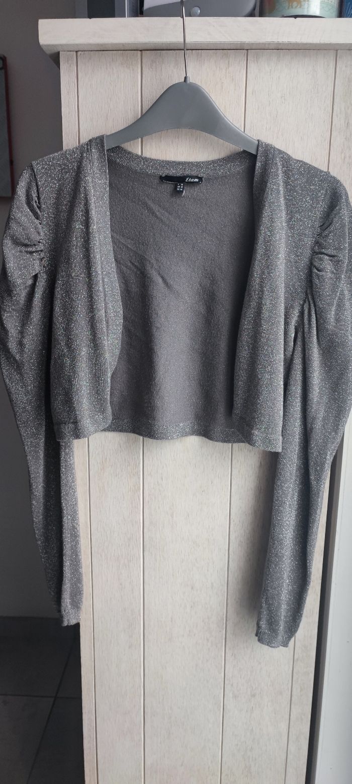 Marque:Etam Taille:38 mensurations en photo Couleur:Gris à paillettes argentées Matière: Étiquette coupée État:En parfait état peu porté Pas de photos portées je ne rentre pas dedans, matière fine et légère,ne se ferme pas Manches longues, bouffantes aux épaules