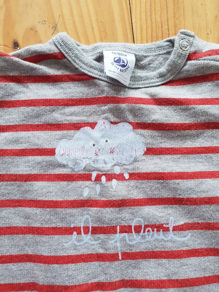 Pyjama Petit Bateau. Taille 3 mois. Motif légèrement usé. Le reste est en très bon état. Réduction sur lot activée