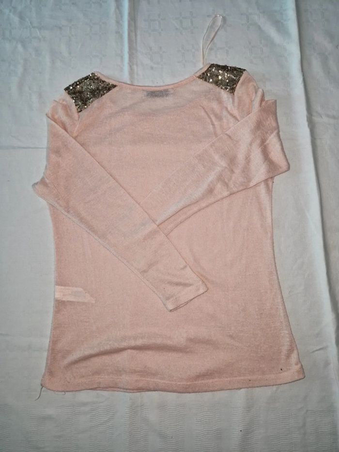 teeshirt léger manche longue rose poudré épaule avec des strass doré