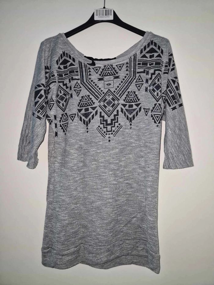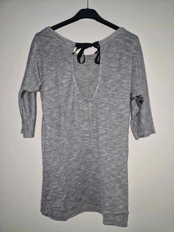 teeshirt manche 3/4 gris imprimé devant dos légèrement dénudé s'accroche au dos avec un lien