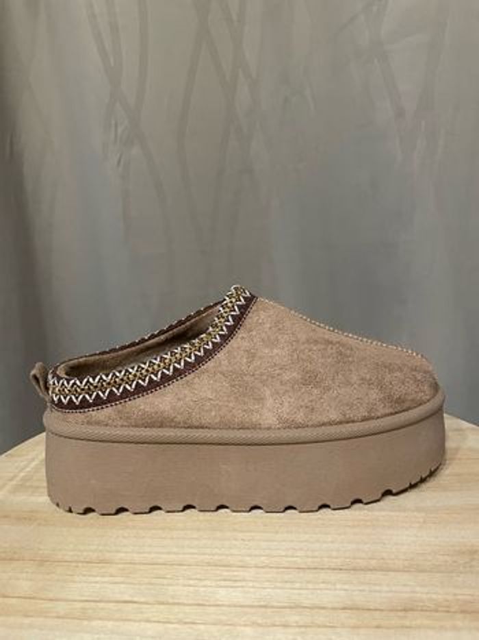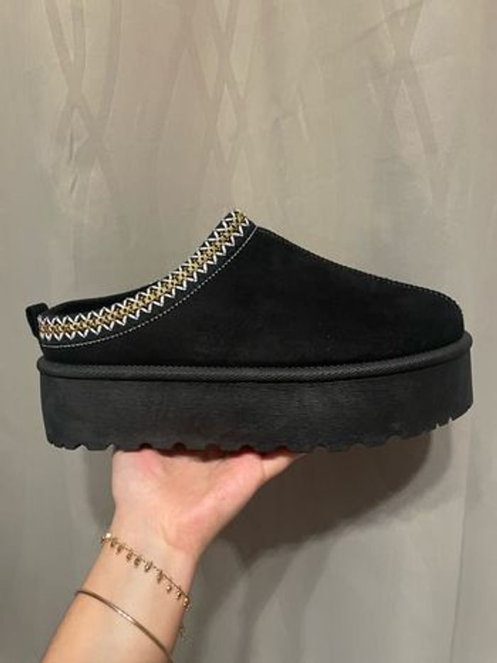 ⚜️ Mules inspiration UGG Tazz • semelles hautes (+/- 5 cm) • fourrées avec une doublure chaude pour plus de confort • Tailles 36 à 41 disponibles en couleurs chesnut/taupe/noir ou beige ⚠️ stock limité, réservation (et + de photos) en mp