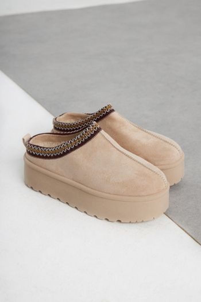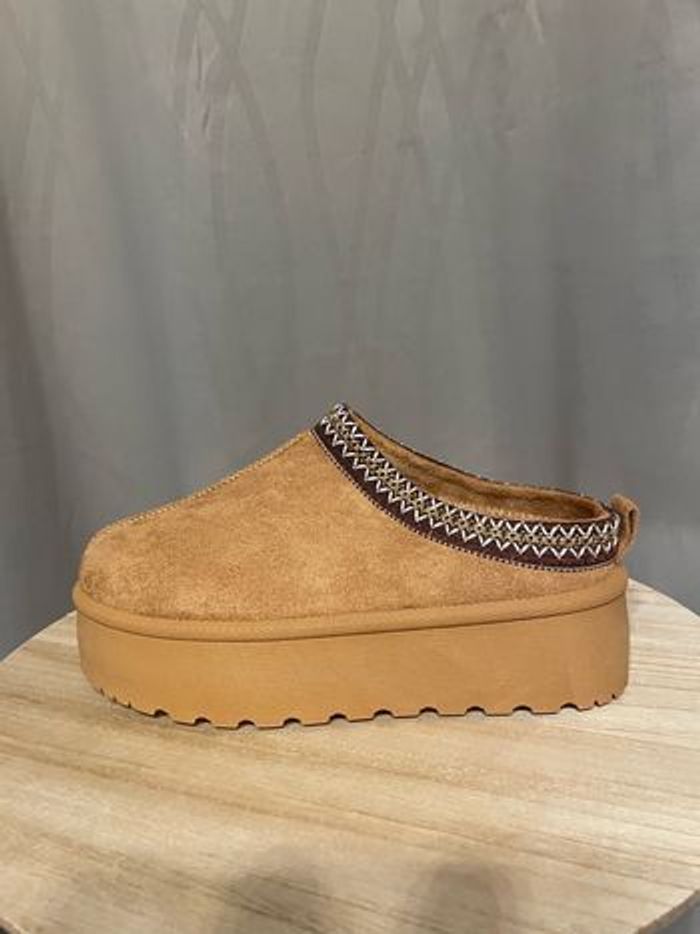 ⚜️ Mules inspiration UGG Tazz • semelles hautes (+/- 5 cm) • fourrées avec une doublure chaude pour plus de confort • Tailles 36 à 41 disponibles en couleurs chesnut/taupe/noir ou beige ⚠️ stock limité, réservation (et + de photos) en mp