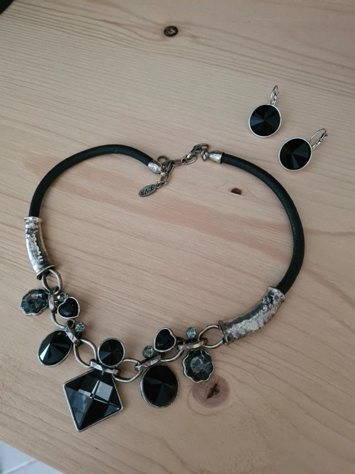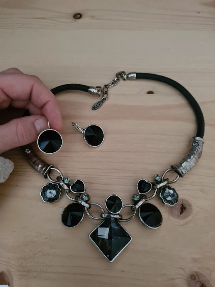 Parure bijoux collier + boucles d'oreilles oreilles noire brillant et argenté #juliebijoux