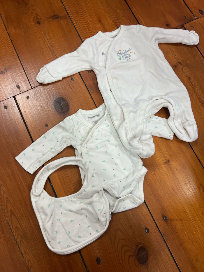 Ensemble pyjama, body et bavoir. Taille 1 mois.