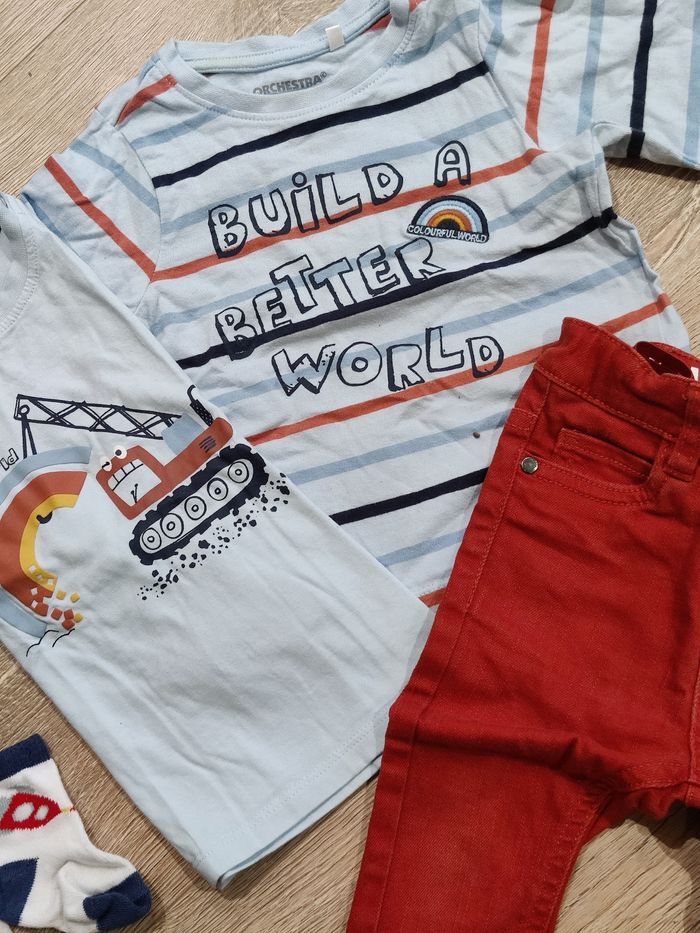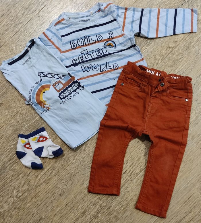 Ensemble jean et tee shirt Orchestra Gémo Taille 12-18 mois - Pantalon jean slim rouge taille ajustable Gémo taille 12 mois - lot de 2 tee shirt Orchestra Taille 18 mois - j'offre 1 paire de chaussettes avec cet ensemble #18mois #orchestra #gémo - envoi rapide et soigné - d'autres articles disponibles dans mon dressing, n'hésitez pas à faire un lot, je propose des remises