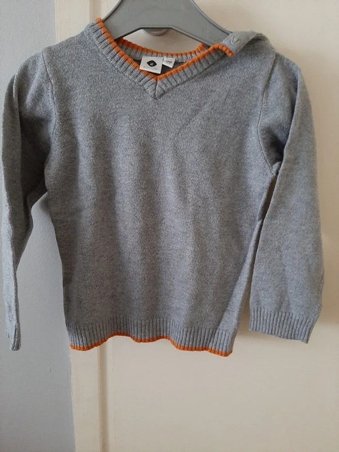 Très beau pull gris avec pressions sur l'épaule pour plus de facilité à l'enfiler de chez grain de blé. Taille 24 mois