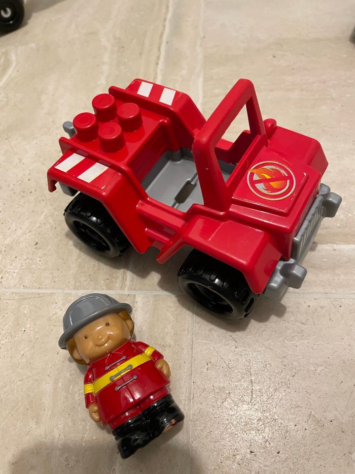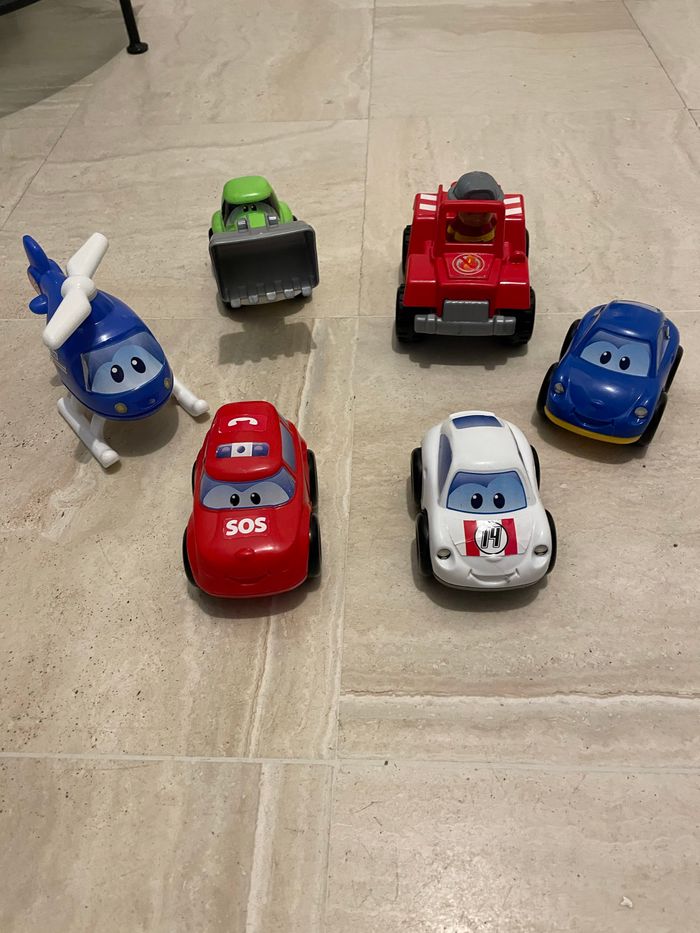 6 voitures Ecoiffier pour jouer avec les constructions Abrick Les autocollants sur l’hélicoptère se décollent un peu