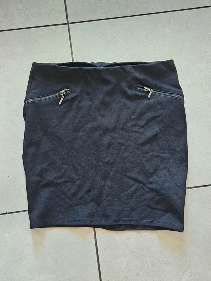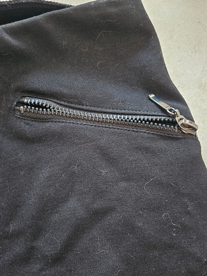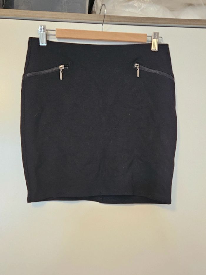 Petite jupe noire moulante Stradivarius en taille L Taille élastiquée Fausses poches avec fermetures éclair grises à l'avant de chaque côté qui reviennent sur l'arrière Coupe proche du corps Matière extensible Parfait état #y2k #y2kstyle #y2kfashion #y2kaesthetic #y2kvintage