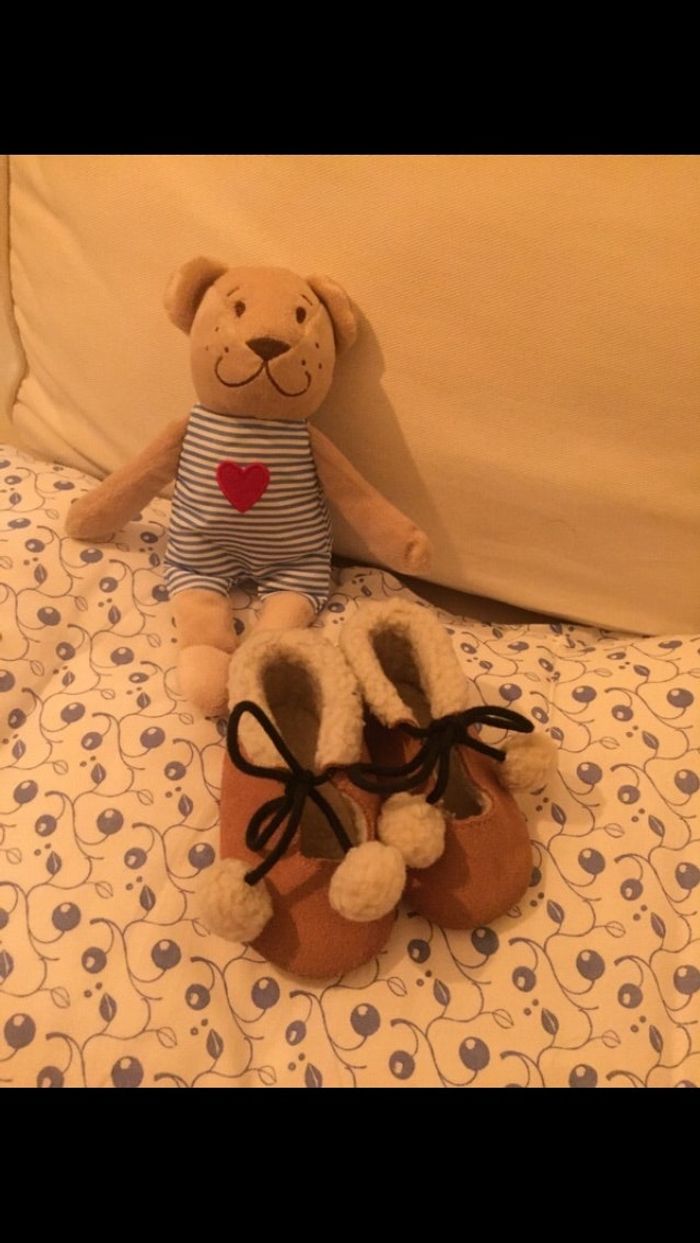 Chausson en daim camel avec petit pompon, porte une fois pointure 17