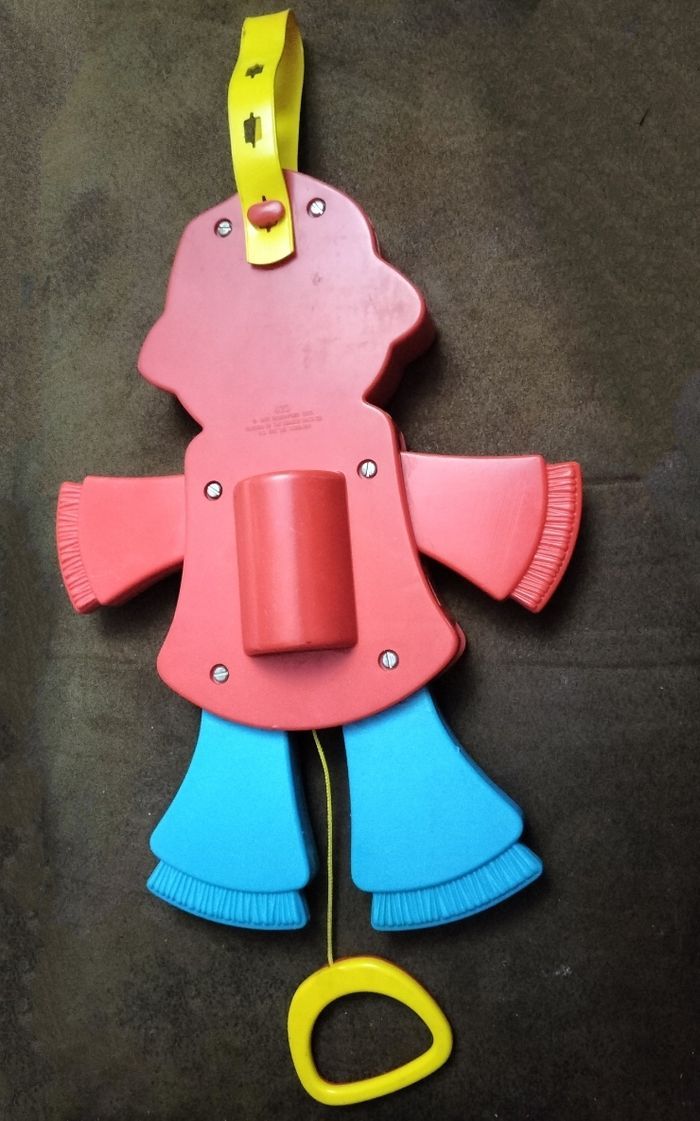 Jouet ancien FISHER PRICE de 1978 en bon état et complet avec son attache jaune ouvrable et réglable. C'est un jouet de parc ou de lit qui s'accroche solidement. Il s'agit d'un pantin représentant un épouvantail. Quand l'enfant tire sur la poignée, il lève bras et jambes, roule les yeux de droite à gauche et émet un petit son Hauteur sans l'attache 29 cm En très bon état général vu ses 46 ans 12€