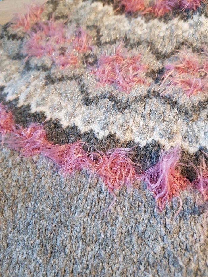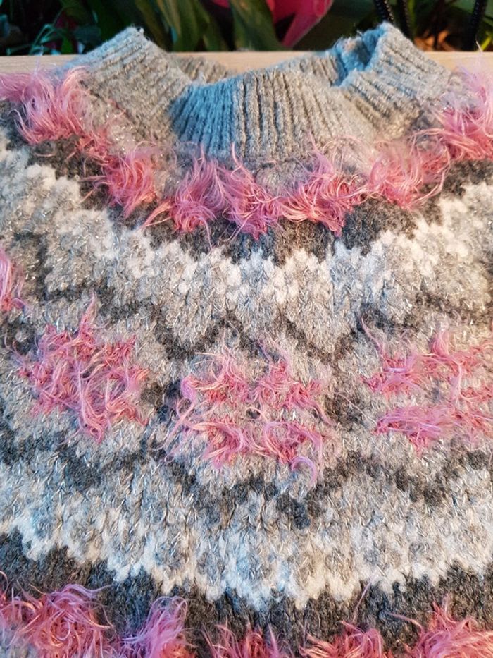 Taille 4/6 ans Grise et rose Manches longues 72% acrylique 16% polyester 10% polyamide 1% élasthanne 1% fibres métallisés Quelques bouloches