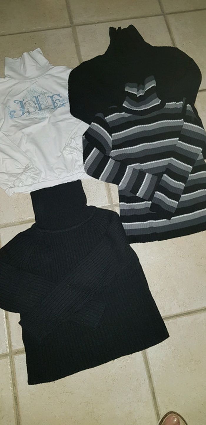 Composé de 4 cols roulés (2 noirs, 1 rayé et 1 blanc et bleu) 1 pantalon noir léger 1 legging gris et violet État satisfaisant