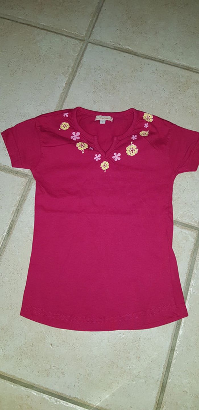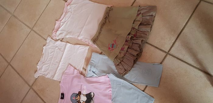 Taille 6 ans Composé d'un tee-shirt manches courtes rose imprimé, d'un tee-shirt manches courtes blanc, de 2 tee-shirts manches courtes (1 blanc et 1 rose), d'une jupe kaki, d'un corsaire bleu clair et d'un tee-shirt manches courtes rose foncé