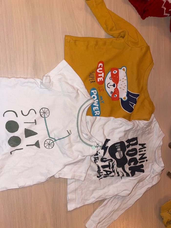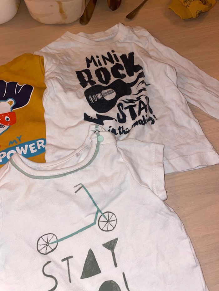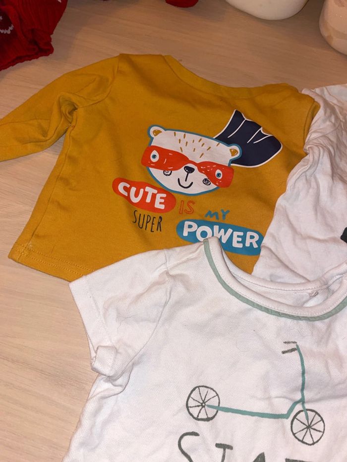 Trois. T-shirts, taille six mois, en excellent état, bleu manches et un à court manche, marque orchestra. #pauliiineee1525taille6moisgarcon