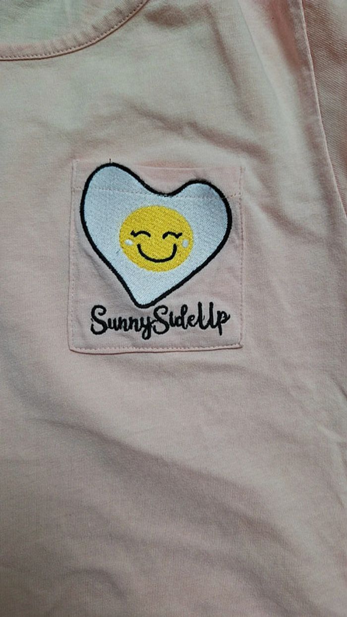 Beau tee shirt. Motif oeuf sur la petite pochette. #fille8anscanellemauve #fille9anscanellemauve #fille10anscanellemauve #fille11anscanellemauve #fille12anscanellemauve