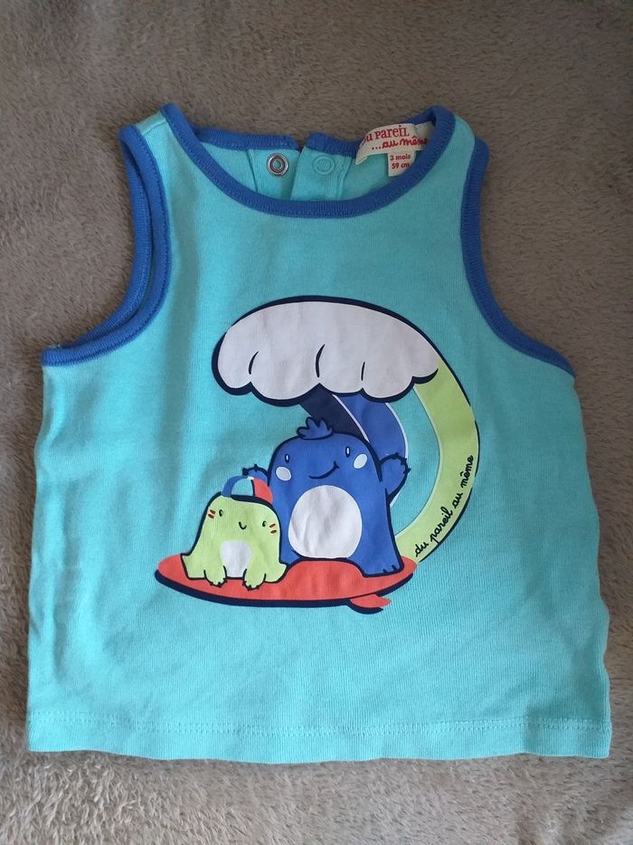 Lot de 5 tee-shirts manches courtes ou débardeur. Différentes marques (DPAM, tape à l'oeil, C&A) L'ensemble est en très bon état. Taille: 3 mois