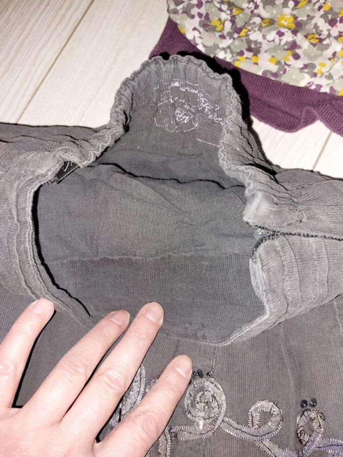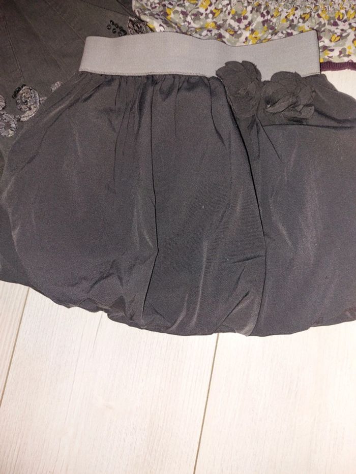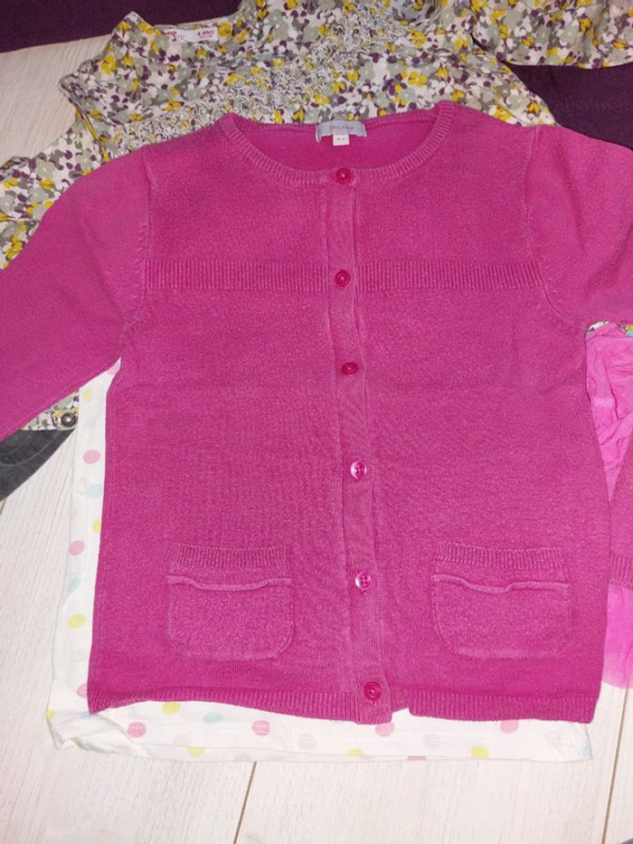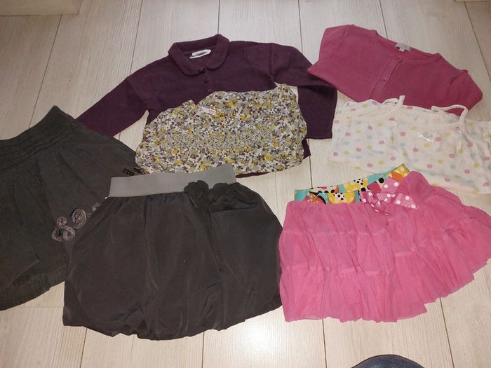 Le reste de mon 4ans petit prix!! Jupe en toile rose fuchsia transparente, jupe boule okaidi, jupe en velours gris foncé, fermeture éclair cassé mais ne gêne pas car jupe élastique, gilet et blouse dpam, le dernier gilet rose je le donne car couleur passé #sanvalmanfille4ans