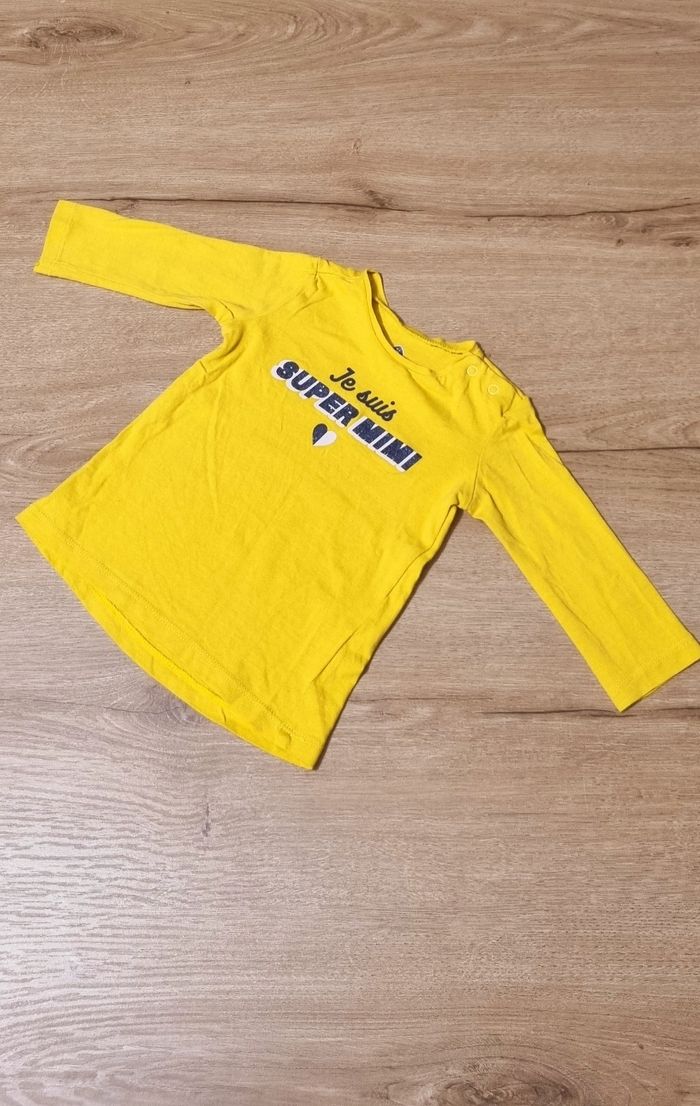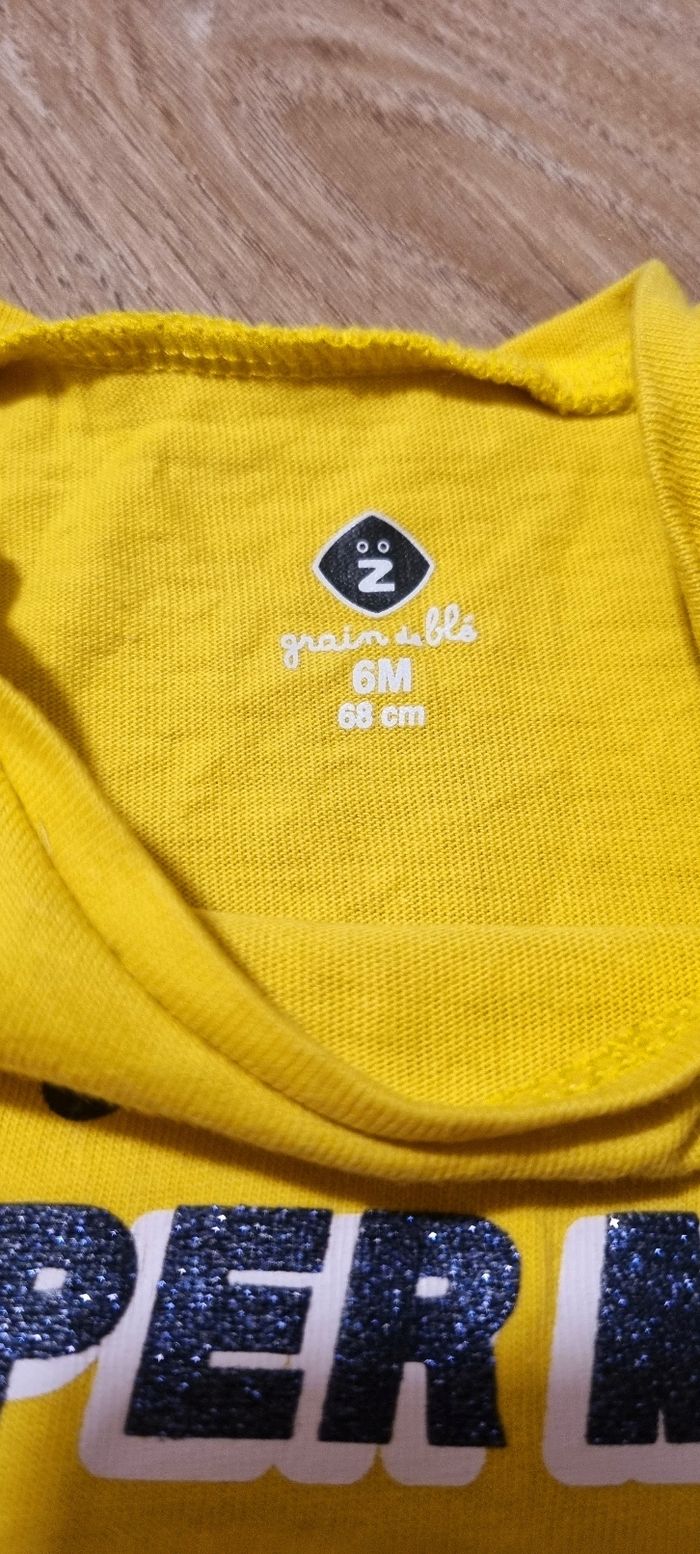 T-shirt à manches longues jaune moutarde avec écriture bleu marine pailleté Grain de blé taille 6 mois Neuf, jamais porté