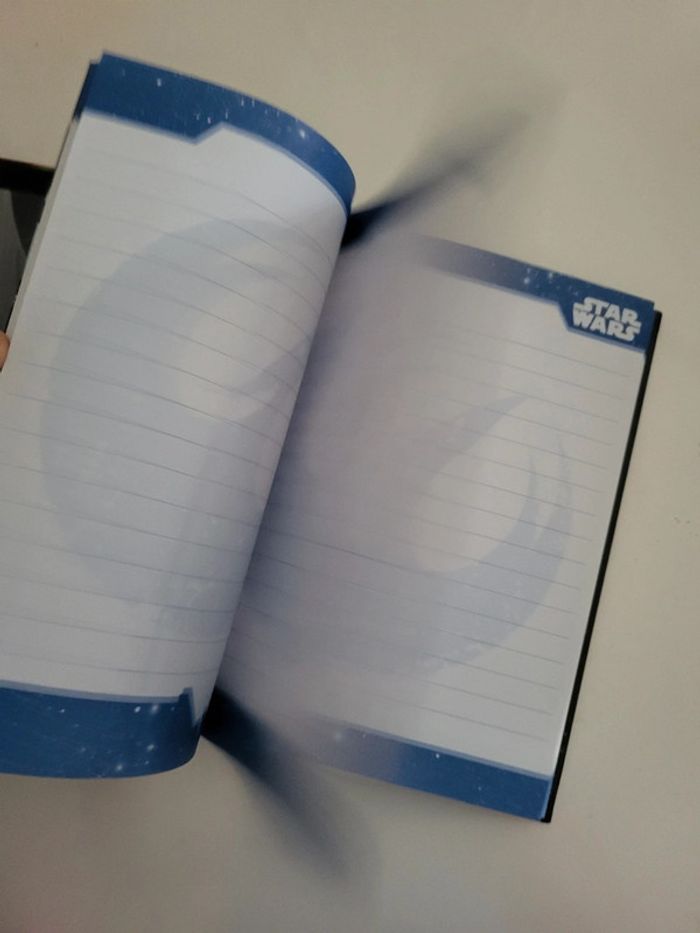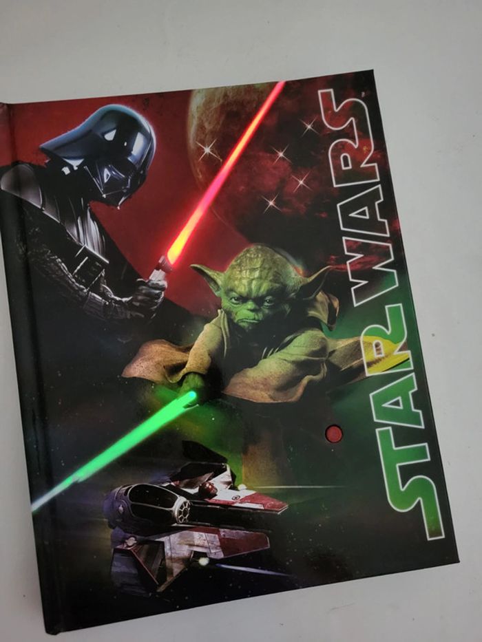 Cahier star wars manque une dizaine de pages mais le reste n'a jamais ete utiliser. La couverture s'allume quand on appuie sur le bouton.