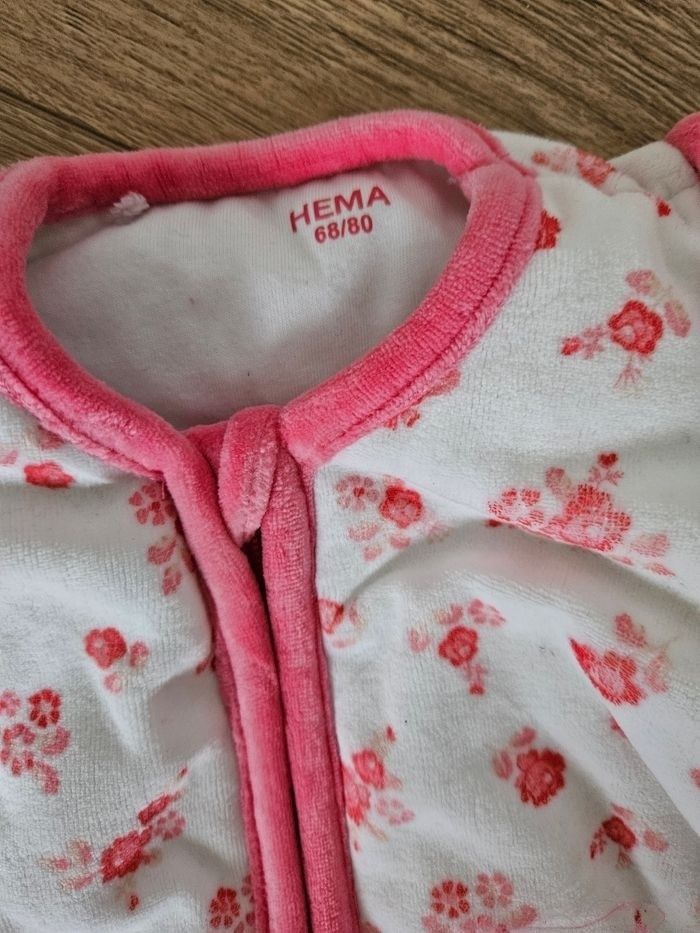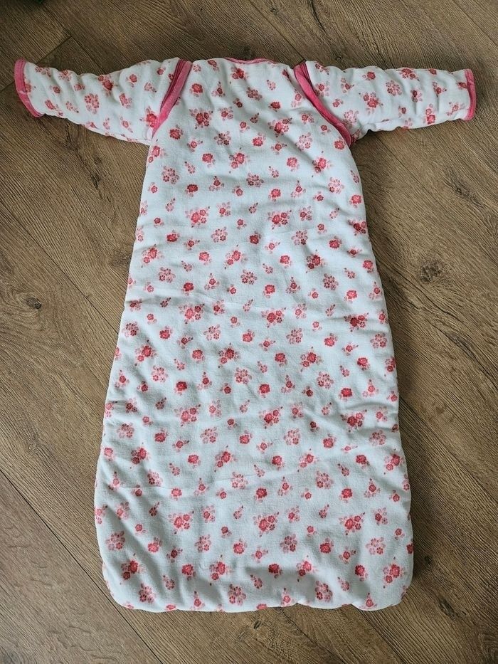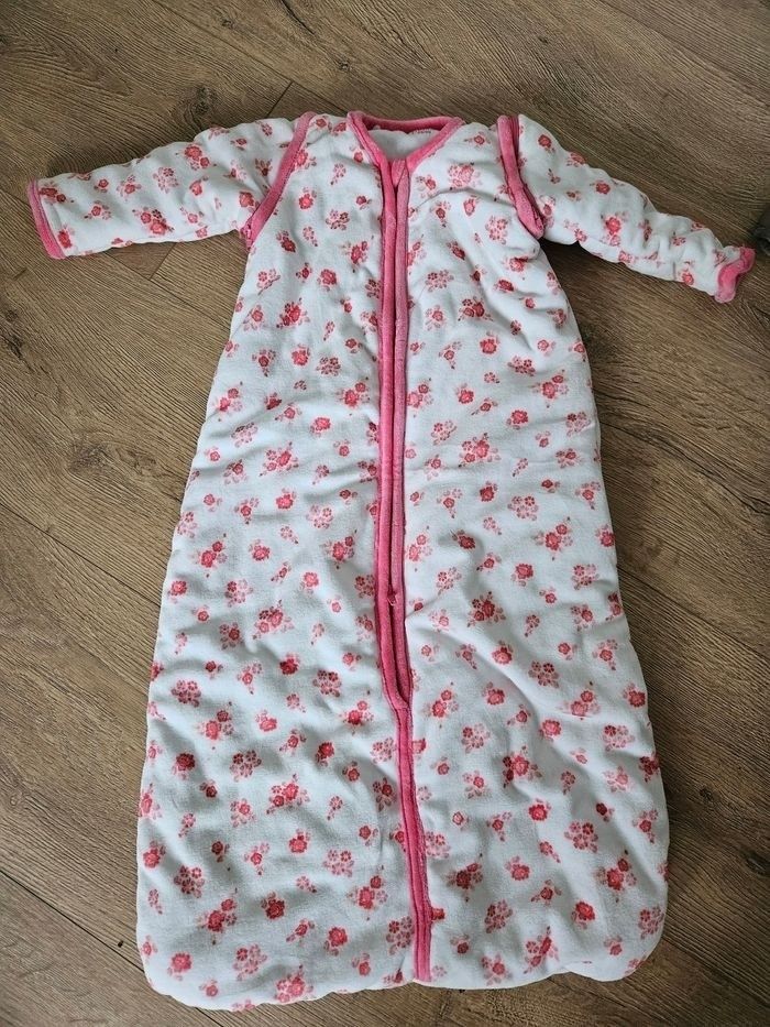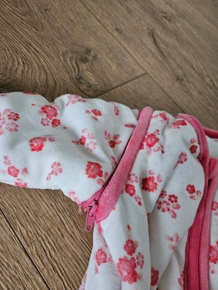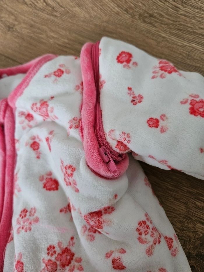 Gigoteuse chaude fermeture éclair Possible d'enlever les maches grâce aux tirettes Taille 68 à 80 Couleur rose- blanche Très bon état