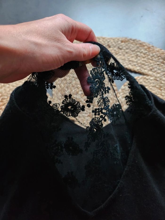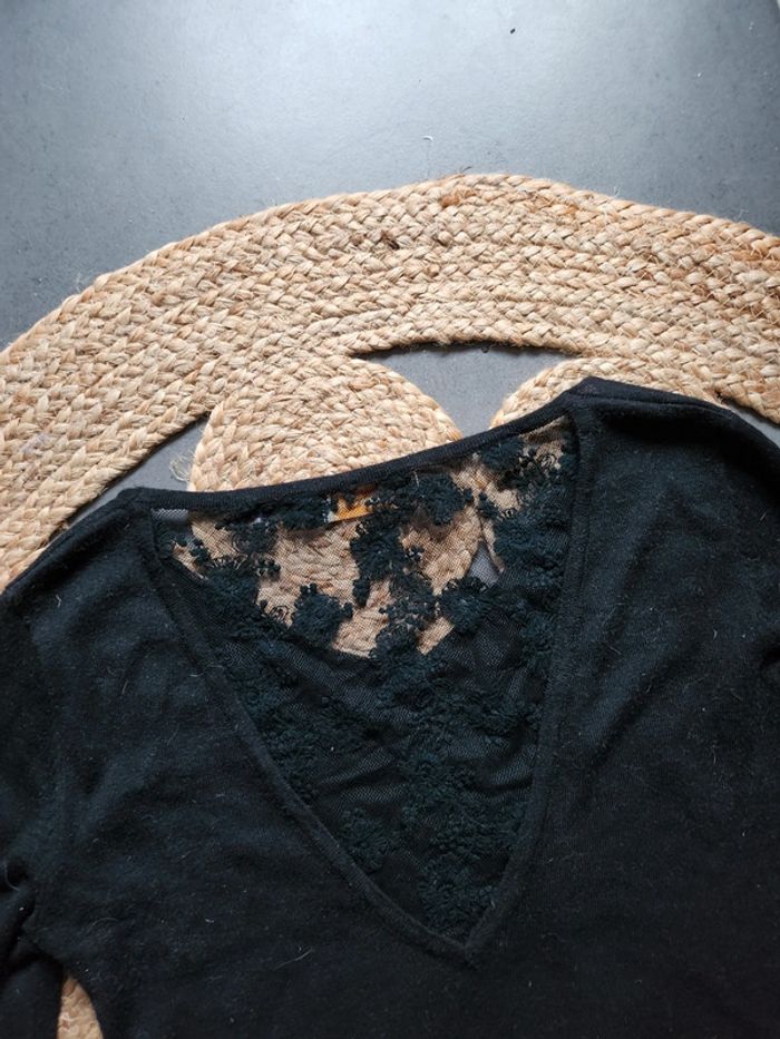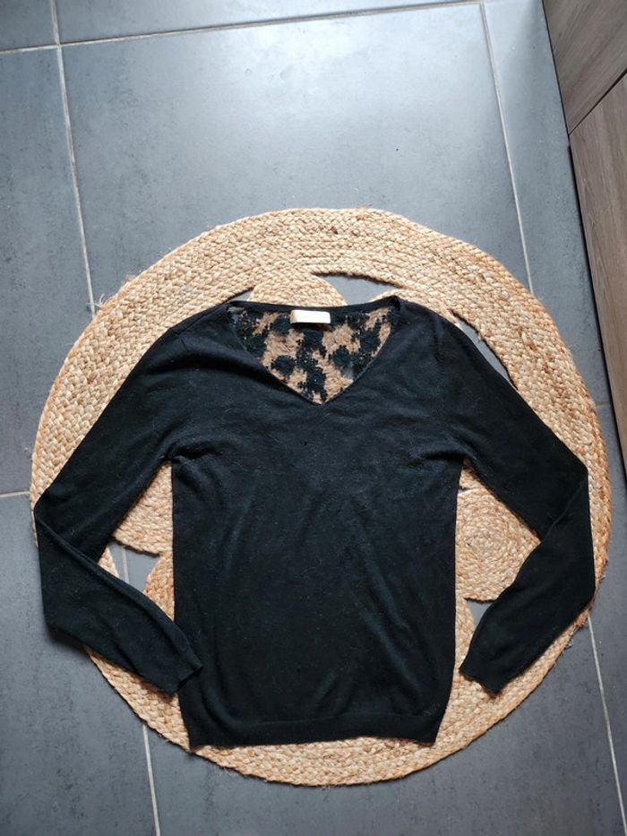 Pull noir en laine Col V, dentelle dans le haut du dos Taille S Marque LC Fashion Très bon état 2€ #pullnoirfemme #pullfemme36 #pull #pull36femme
