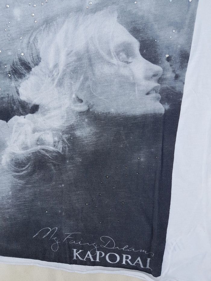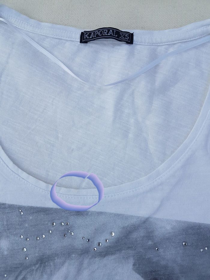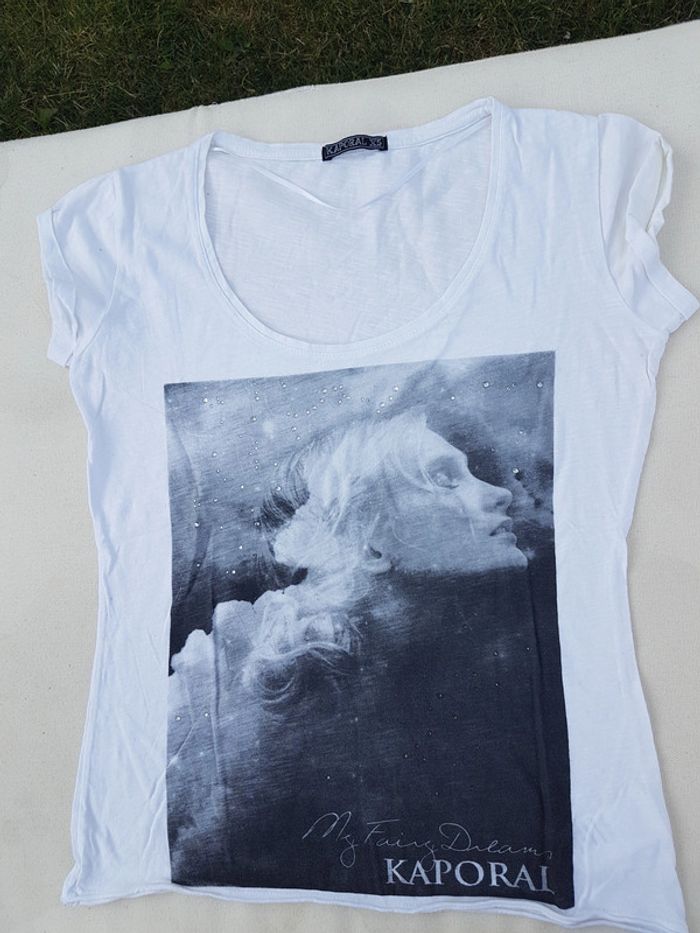 Tshirt blznc manches courtes marque kaporal avec petits brillants... Légère tâche sur le col (voir photo). Le reste est en tres bon etat.