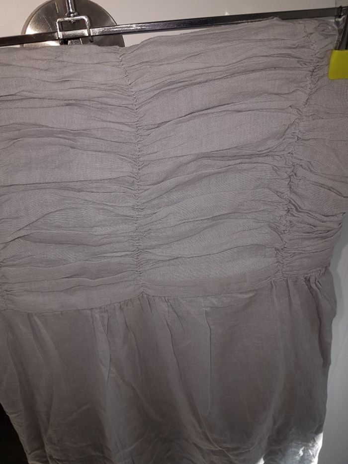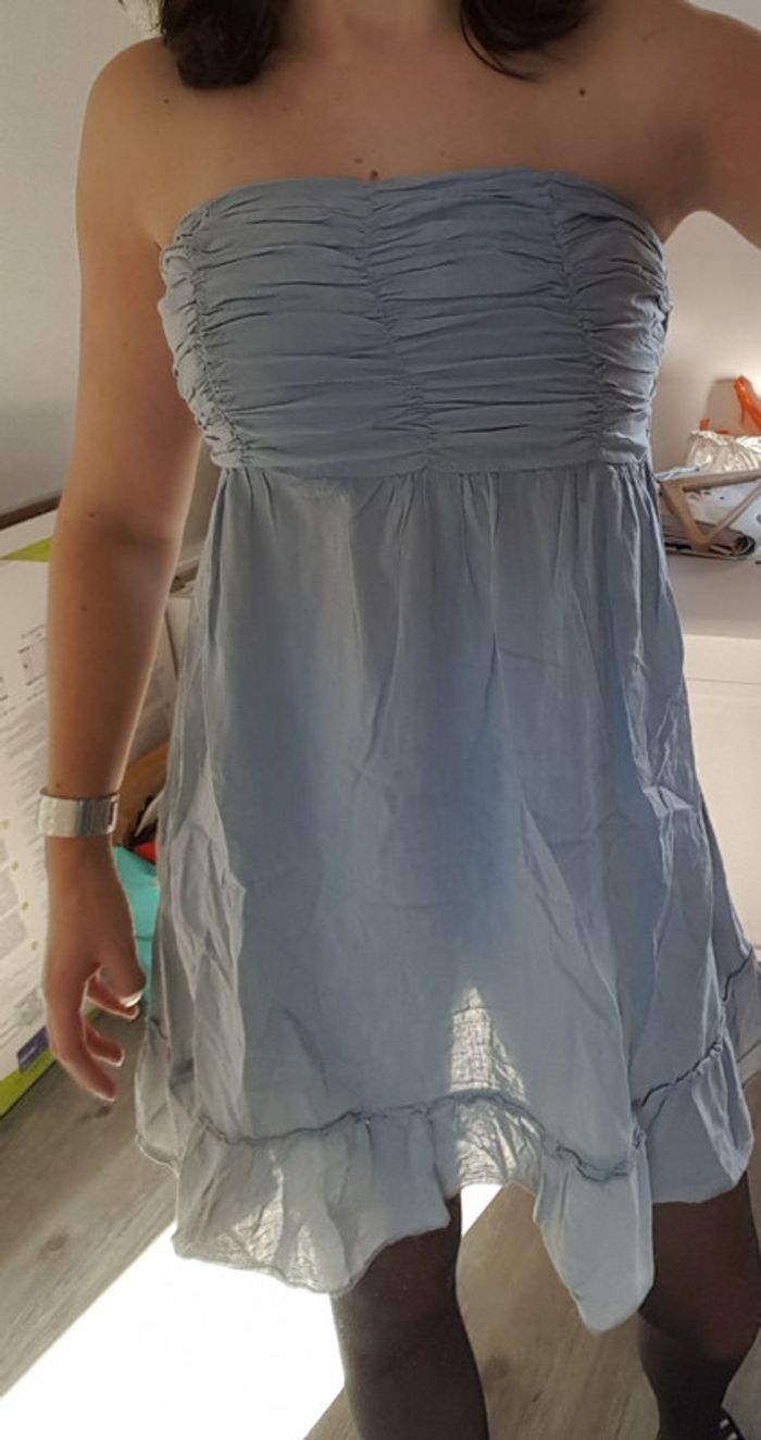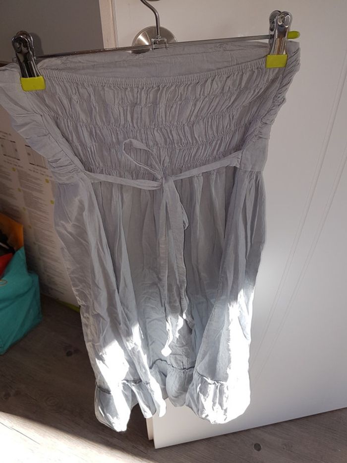 Jolie robe plissée gris clair dos nu. Lacet resserrable dans le dos.