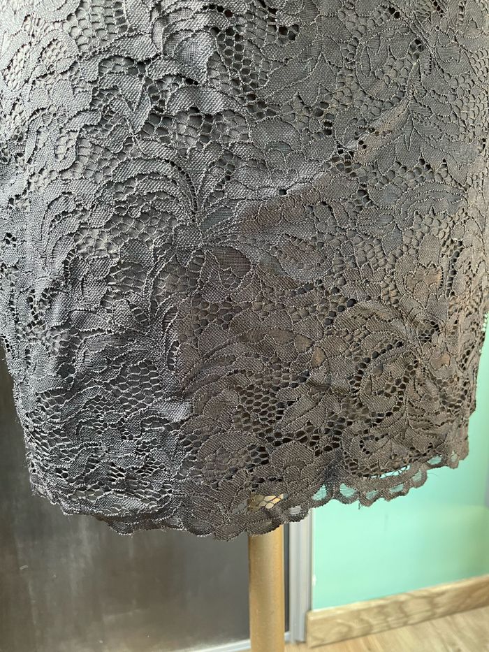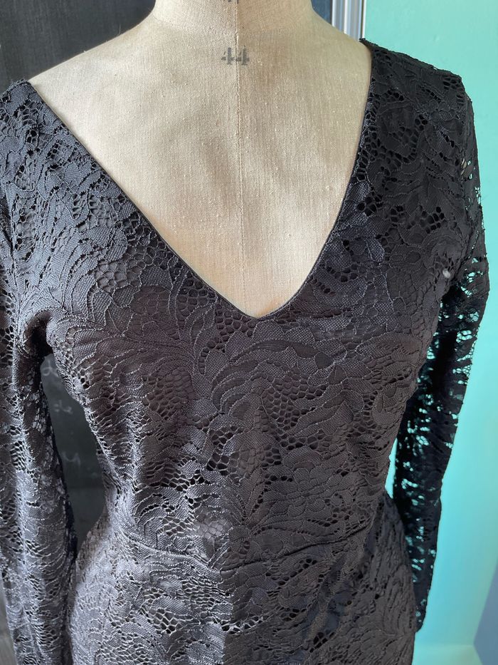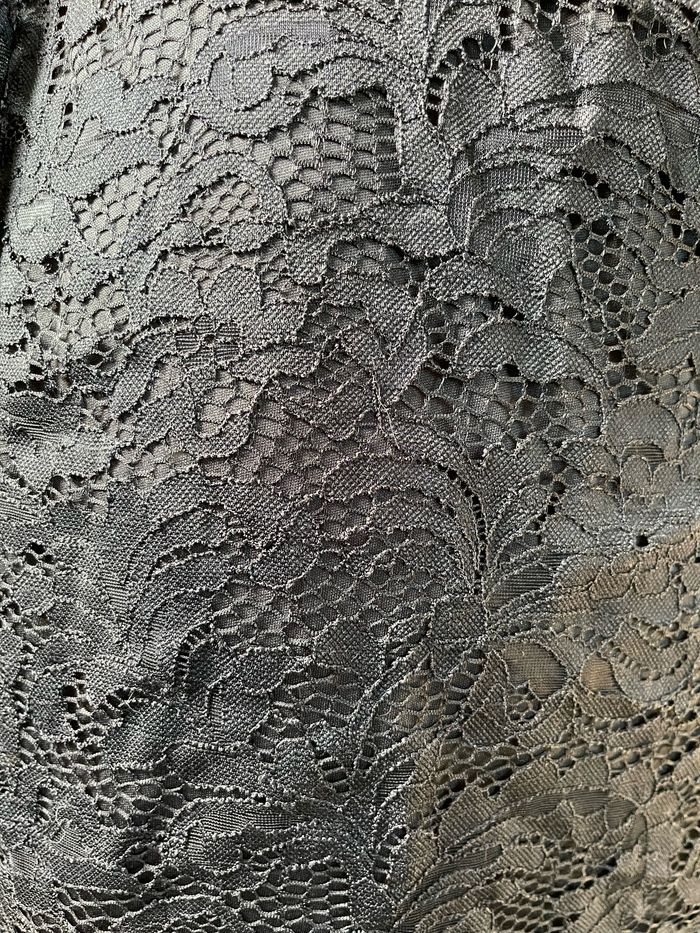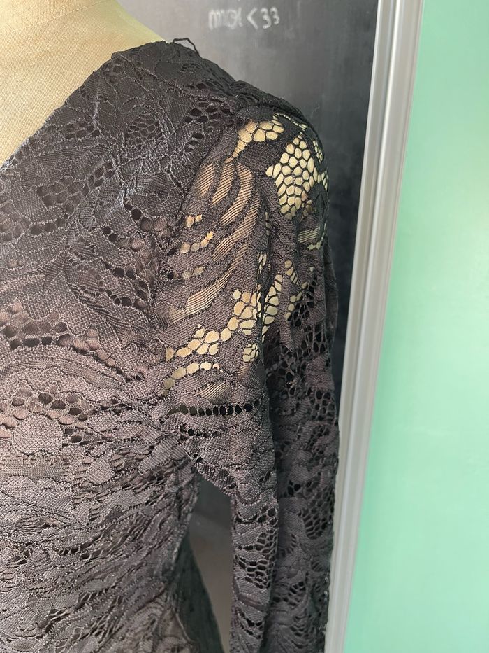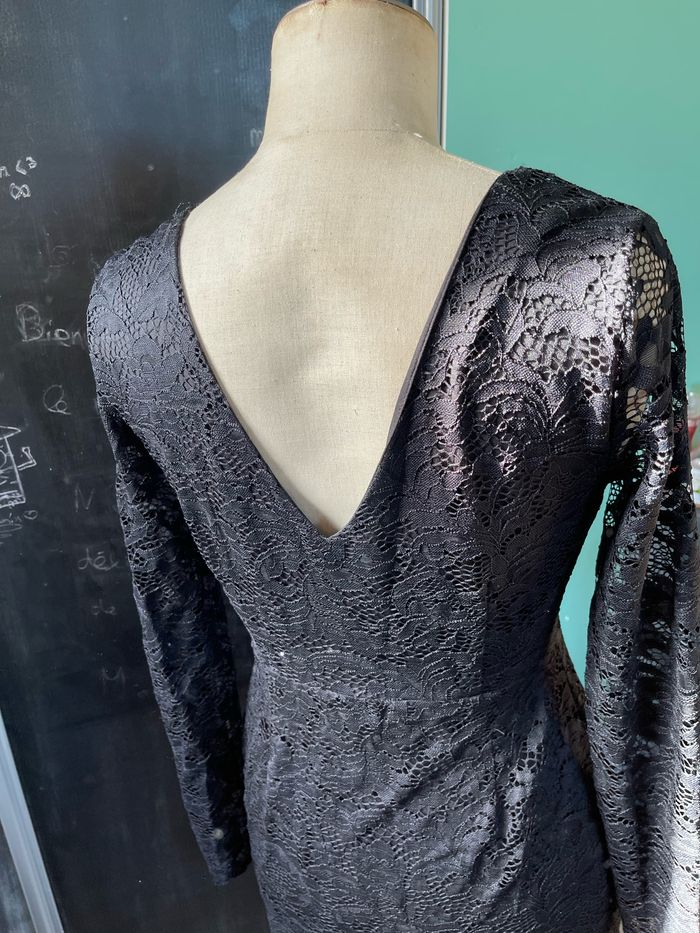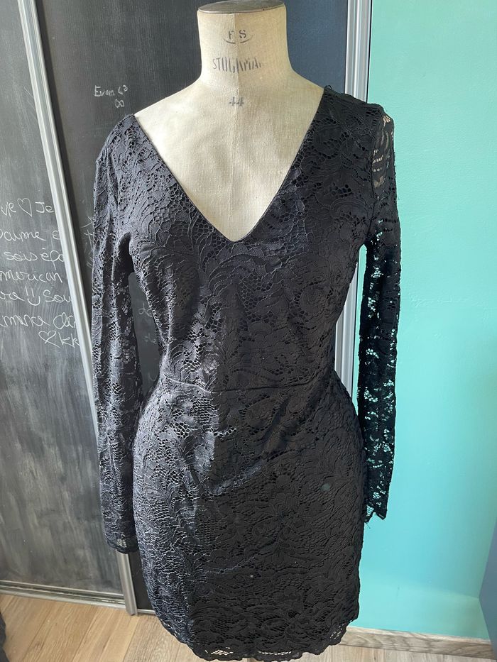 Petite robe noire à manches longues décolleté devant et dos - tissu polyester elastane en dentelle doublé sauf au niveau des manches laisse la peau apparaître État quasi neuf portée une fois Longueur : 87 cm Tour de poitrine: au niveau des aisselles: 87 cm Tour de taille: 74 cm CRO