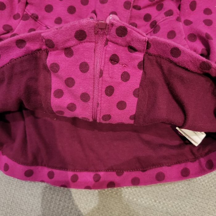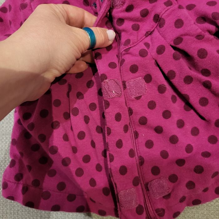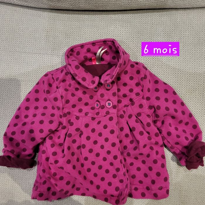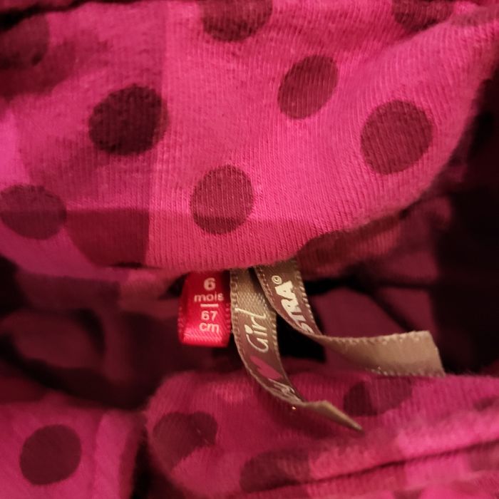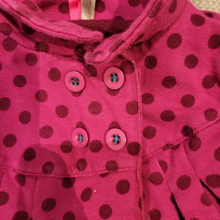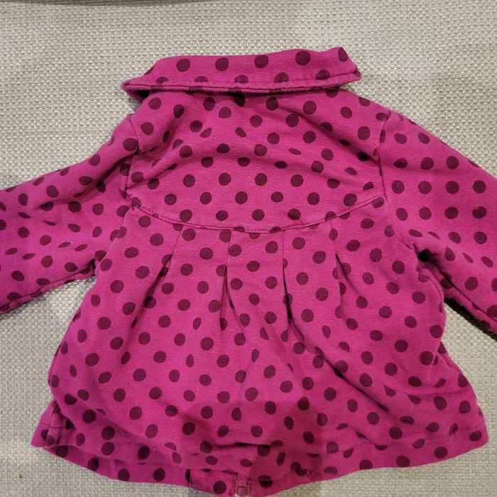 Belle veste rose à pois violine. Sans capuche. Fermeture à scratch et Fermeture éclair sur le devant. Détail de 4 faux boutons niveau col. Taille 6 mois Très bon état Marque orchestra