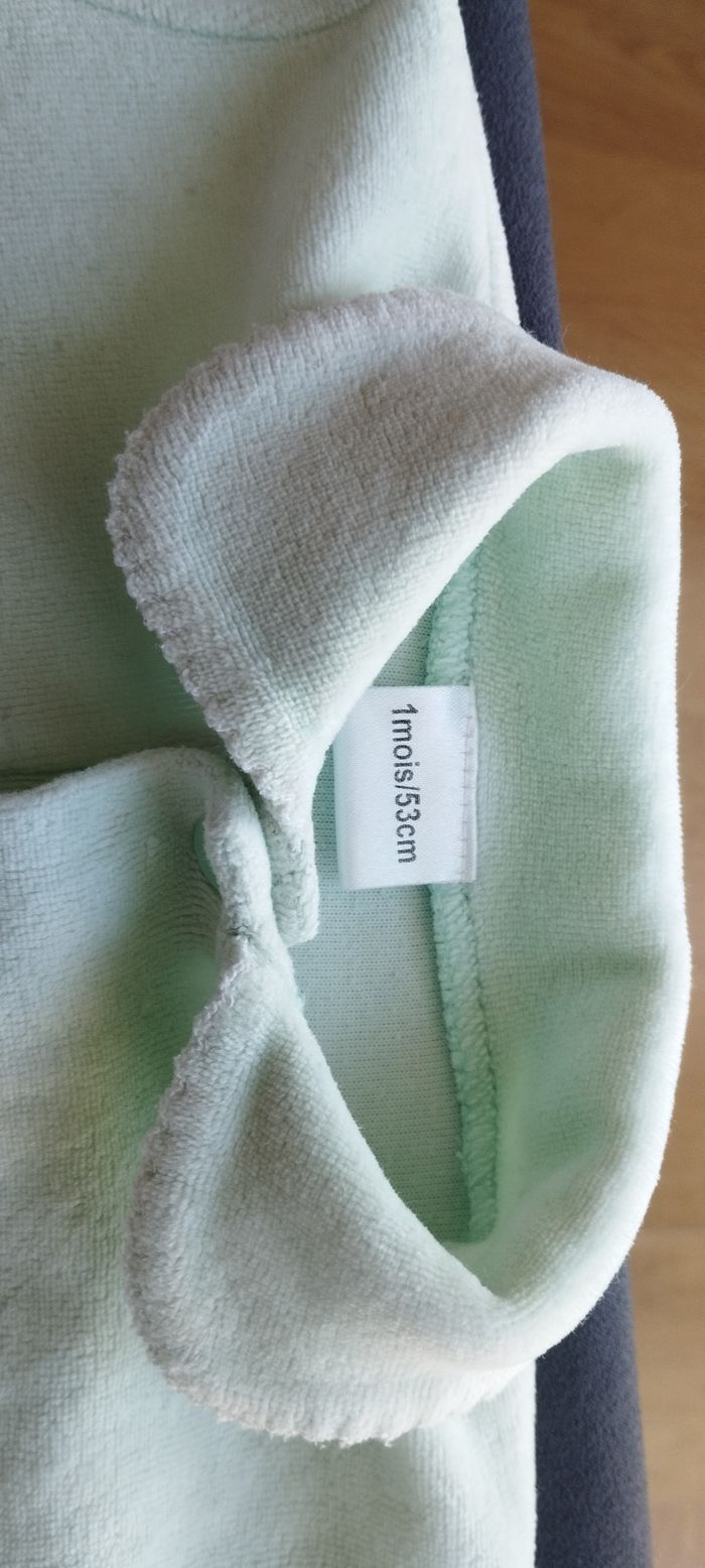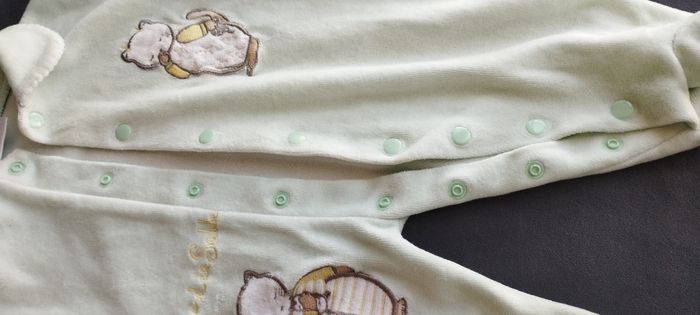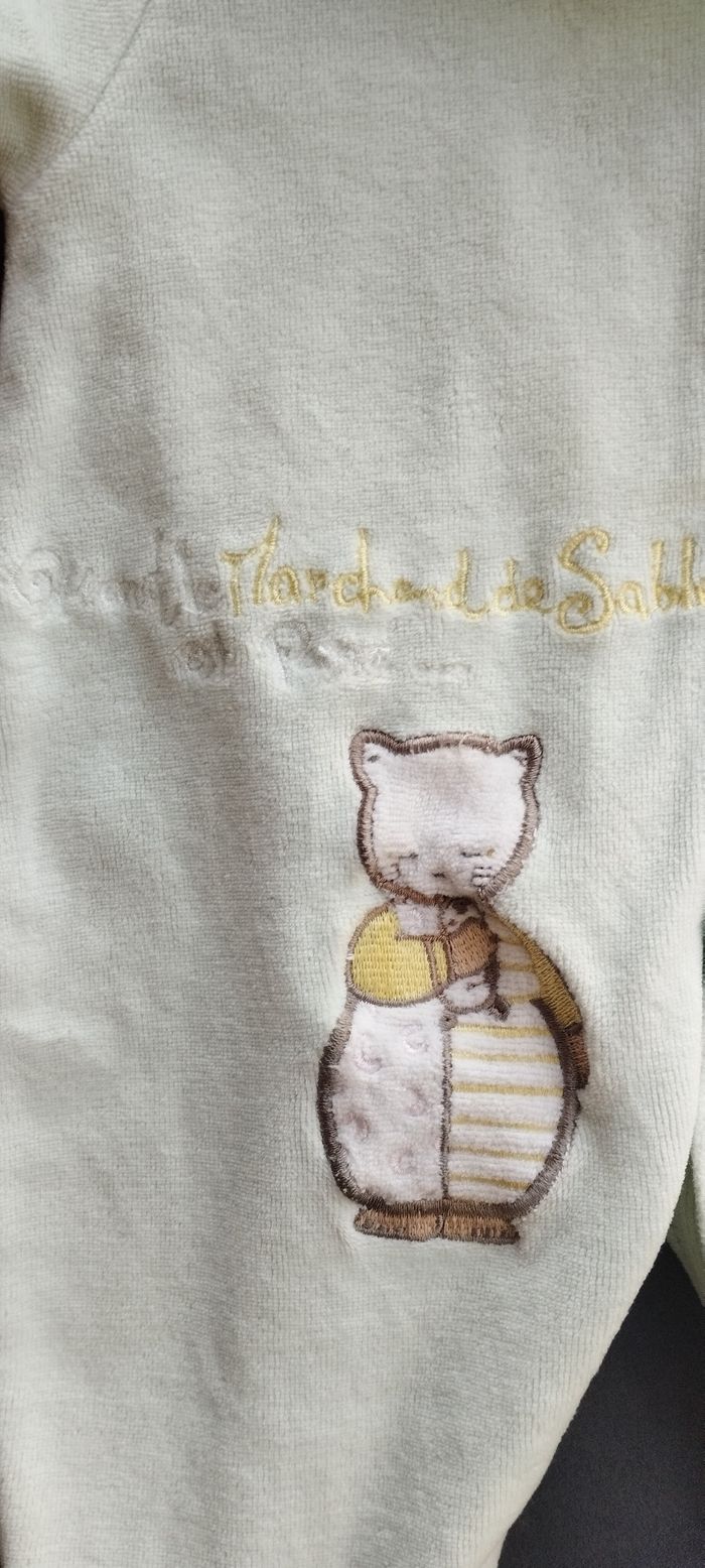 Mignon petit pyjama pour bébé d'1mois de la marque le marchand de sable est passé, peut être pour garçon et fille ! touché tout doux comme velours, 2 broderies petits chats sur le devant , col arrondi, fermeture à boutons pressions du haut aux pieds. Couleur vert pâle. Très bon état.