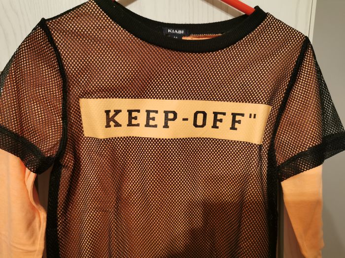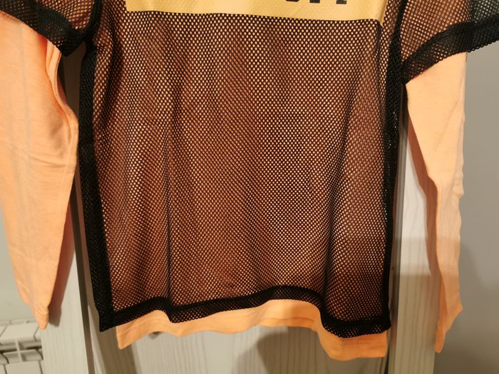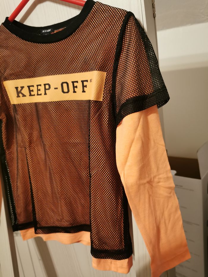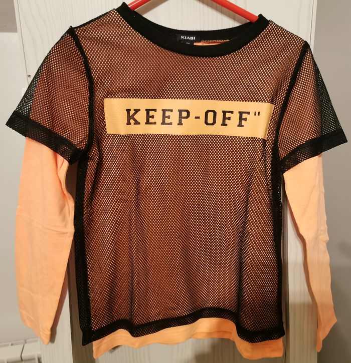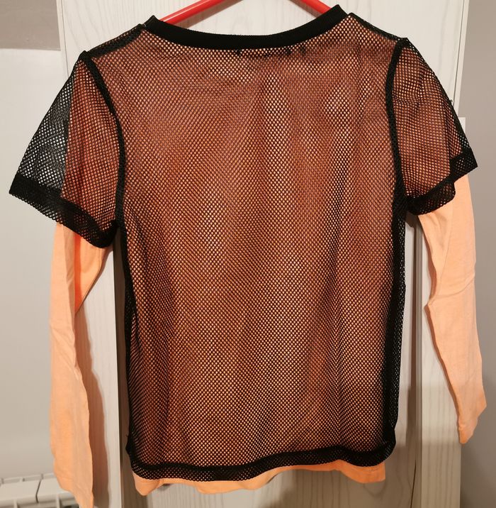 T-shirt manches longues "kiabi" taille 6 ans. Orange avec un filet noir superposé et transfert sur le devant. En très bon état. Réduction automatique de 10 à 20% sur les lots à partir de 2 articles achetés et frais d'envoi le moins cher possible.
