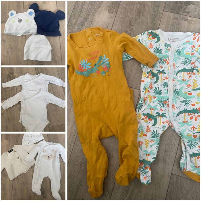 Lot vêtement bébé de 1 mois a 6 mois en très bon état le lot comprend : 2 bodies 3mois 2 grenouillères 6mois 4 bonnets 1 brassière 1 mois Une grenouillère 1 mois